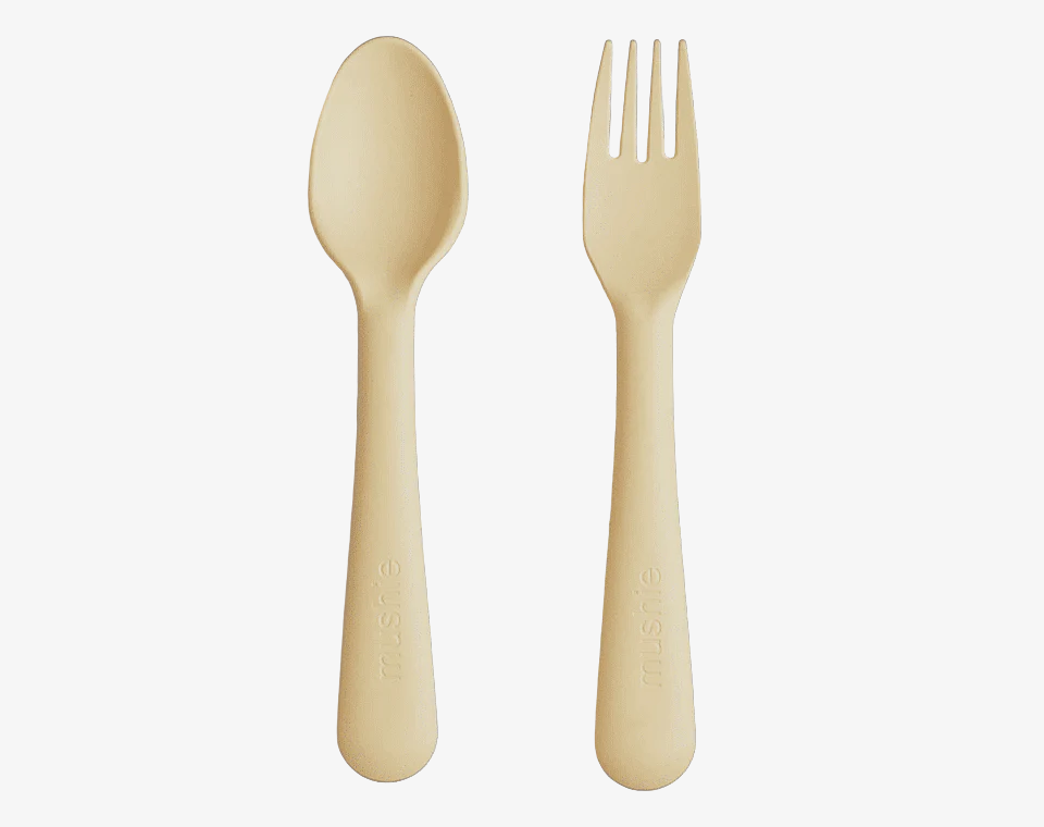 סט כף ומזלג מבית מושי עשויים פלסטיק פוליפרופילן ללא BPA, מגיע במגוון צבעים רכים ועיצוב נקי וקלאסי