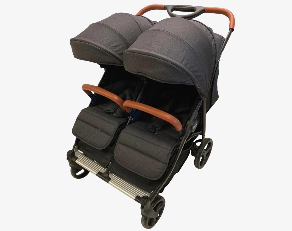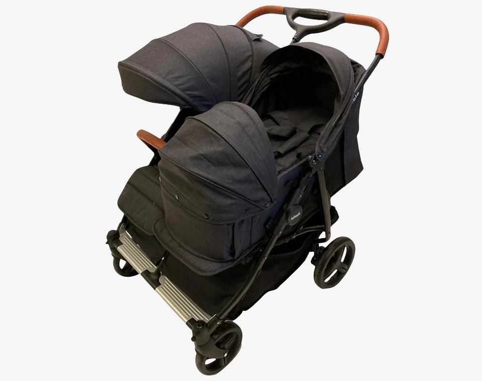 עגלת תאומים דובלו מבית Infanti בצבע שחור , עם גגון ענק , 5 מצבי שכיבה/ישיבה ומנח רגליים מתכוונן