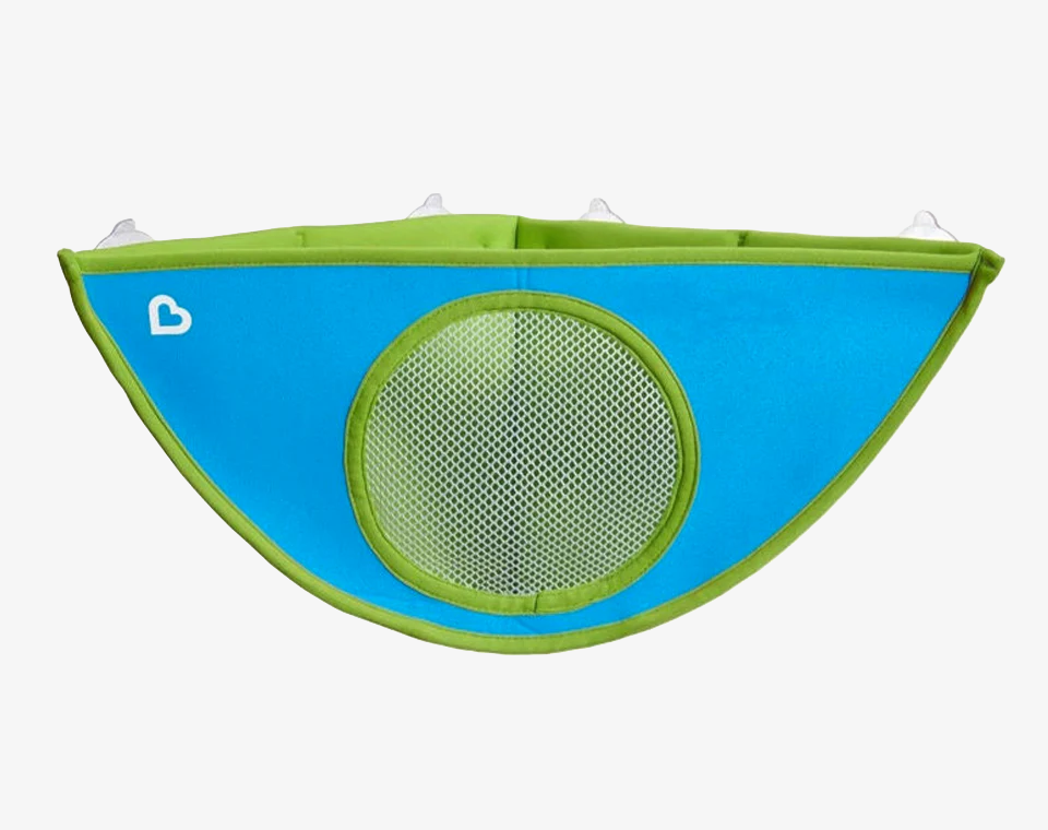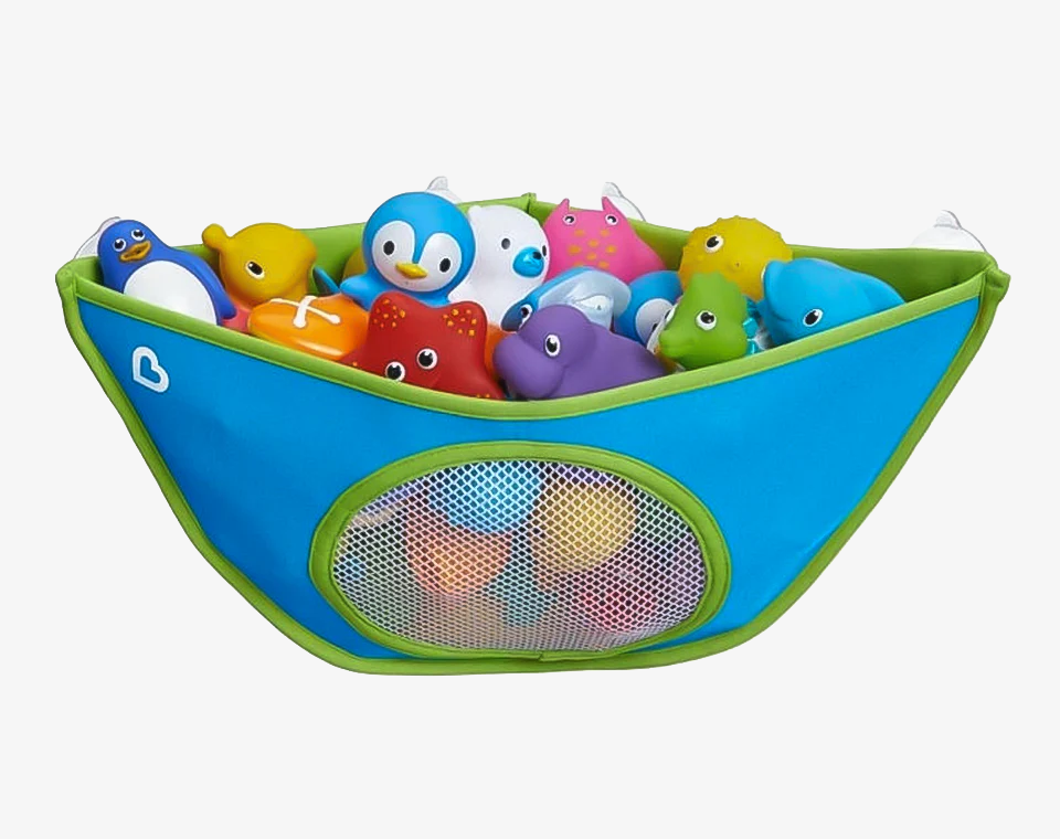 - סל צעצועים לאמבטיה, נתפס בקלוח לאריחי האמבט על ידי 4 דבקיות רב פעמיות
