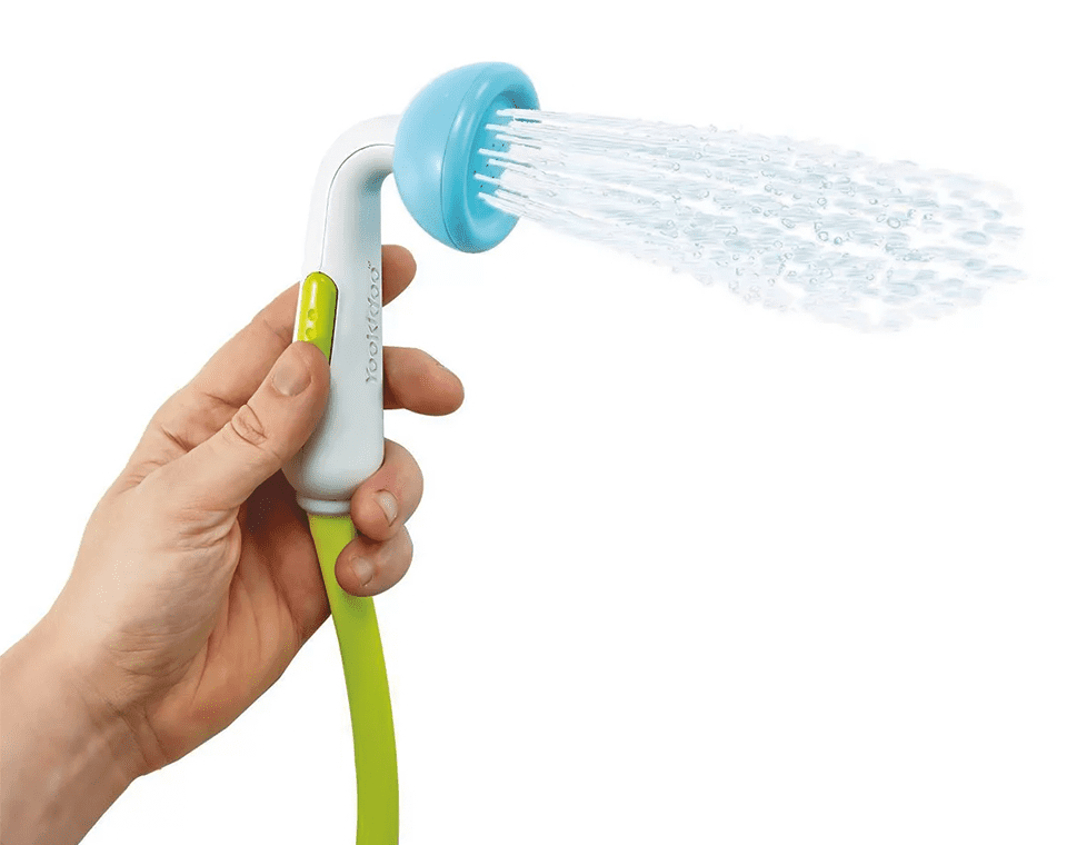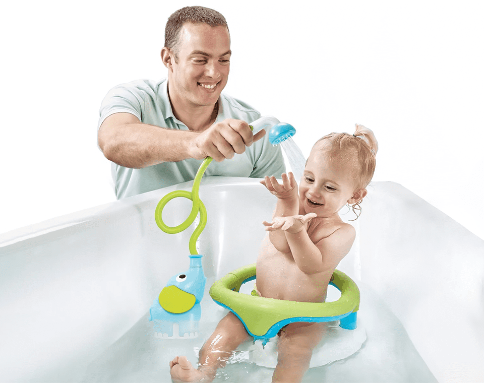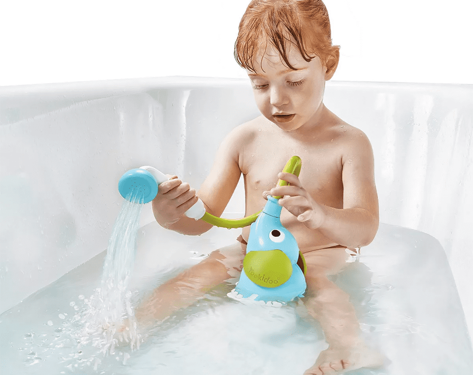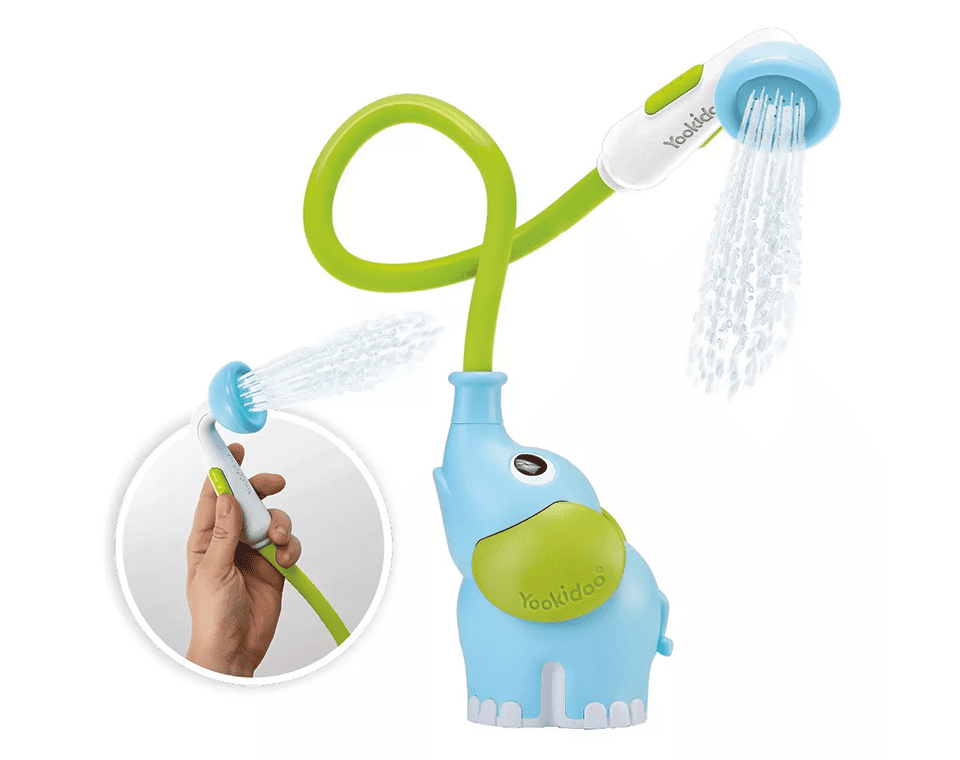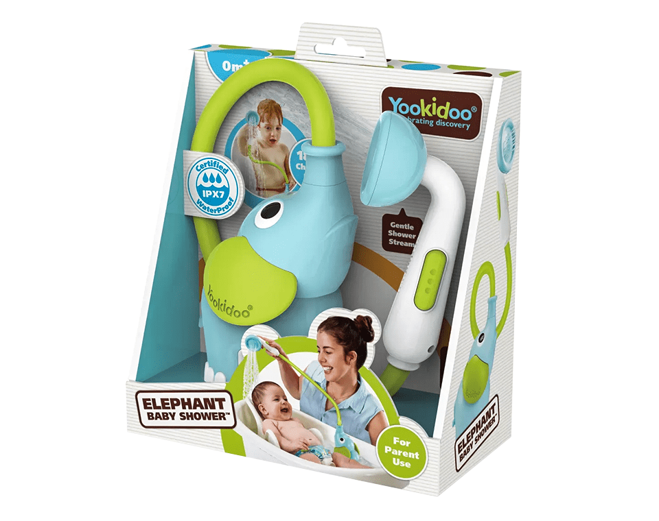 משאבה בצורת פיל מבית Yookidoo, מופעלת ע״י 4 סוללות וצינור גמיש למקלחון המזליף מים בזרם עדין ומאפשר ניקוי התינוק בצורה בטוחה ונעימה.