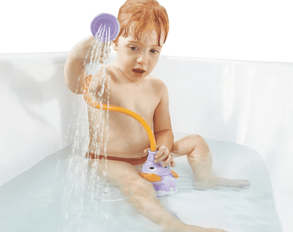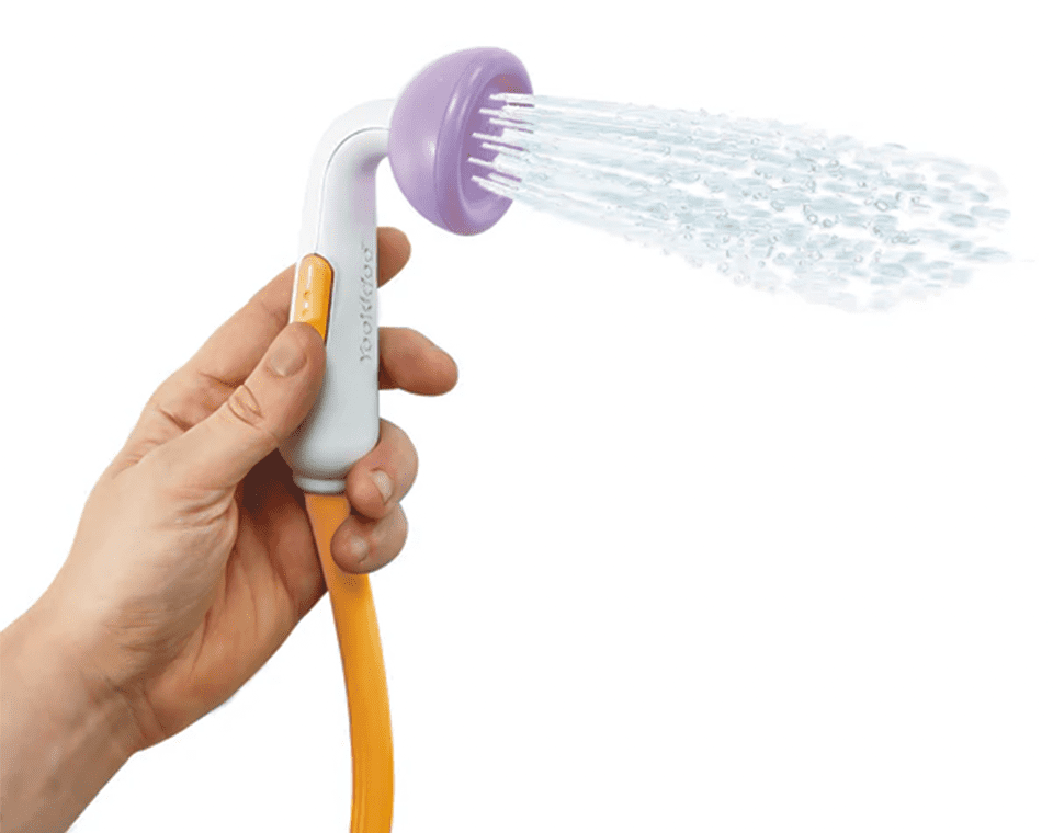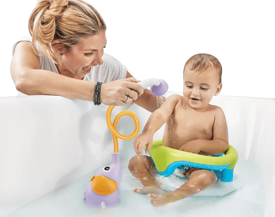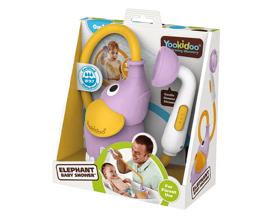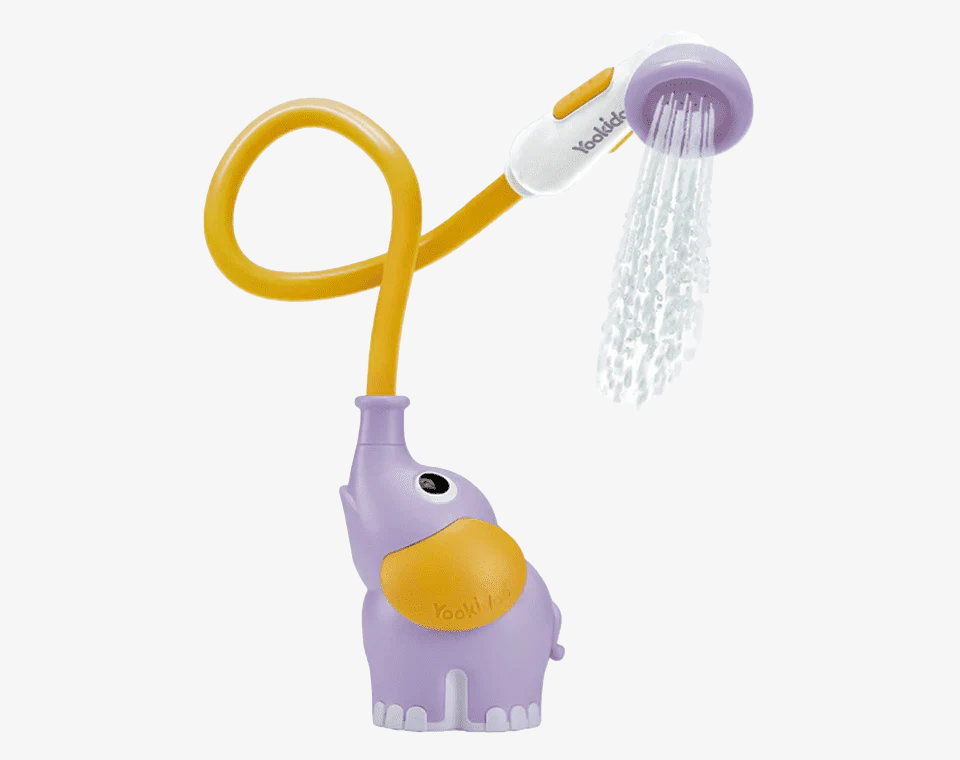 משאבה בצורת פיל מבית Yookidoo, מופעלת ע״י 4 סוללות וצינור גמיש למקלחון המזליף מים בזרם עדין ומאפשר ניקוי התינוק בצורה בטוחה ונעימה.