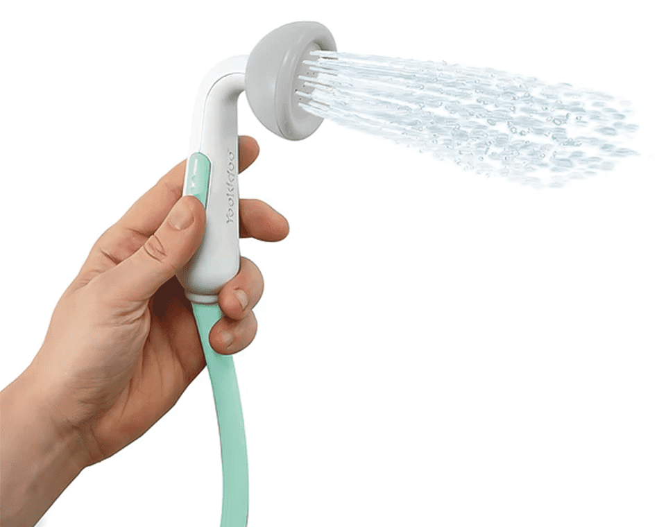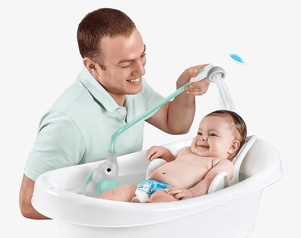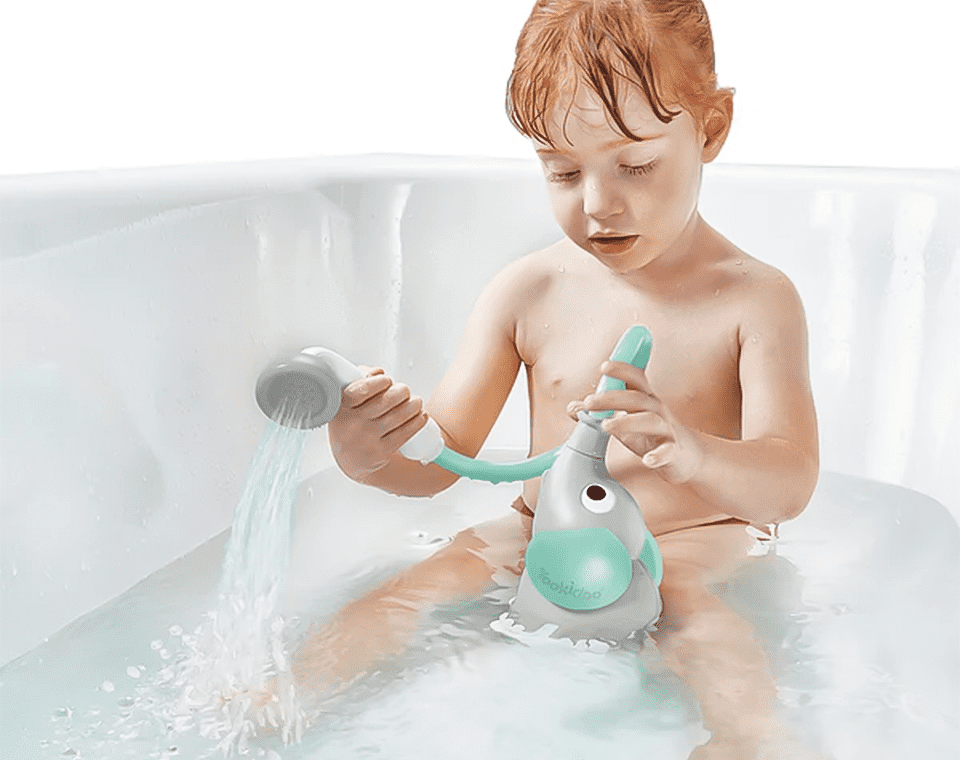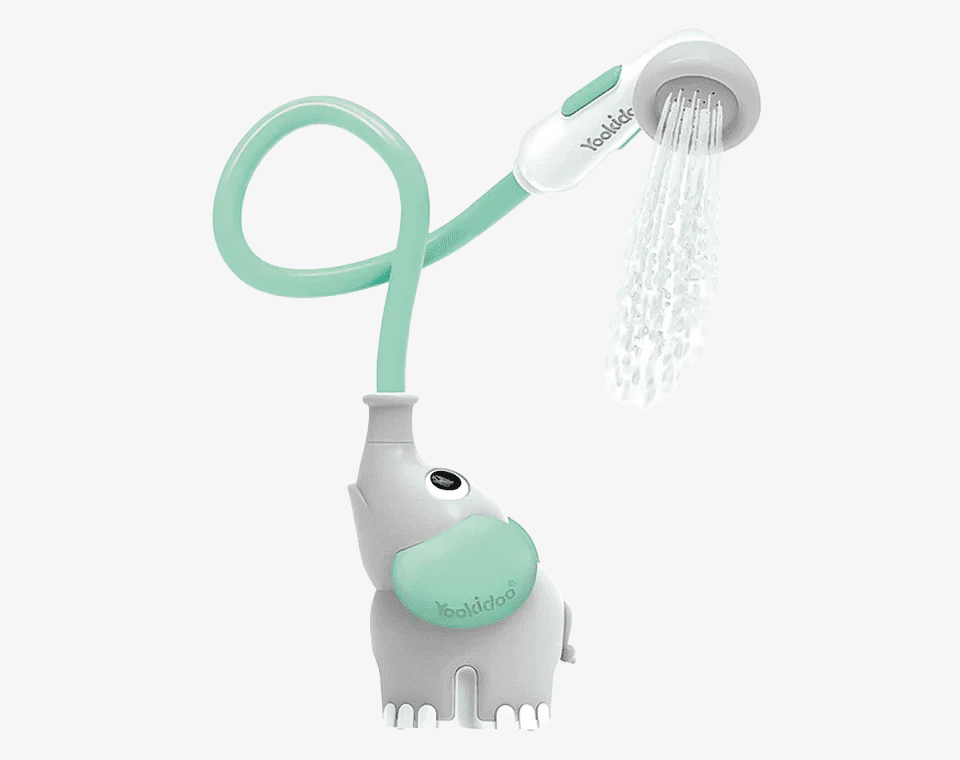 משאבה בצורת פיל מבית Yookidoo, מופעלת ע״י 4 סוללות וצינור גמיש למקלחון המזליף מים בזרם עדין ומאפשר ניקוי התינוק בצורה בטוחה ונעימה.