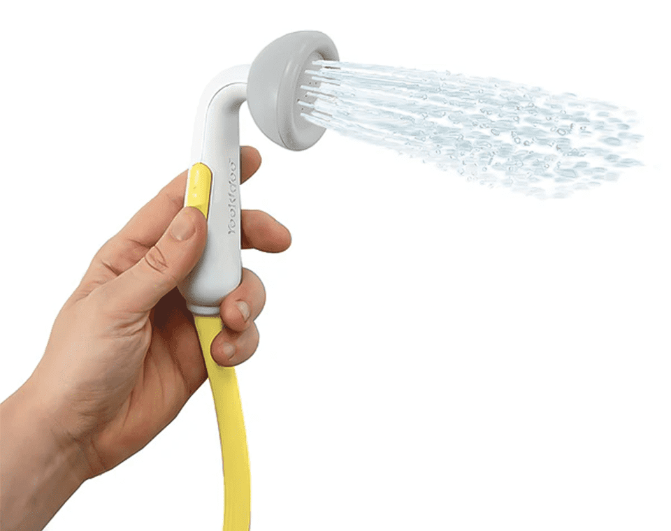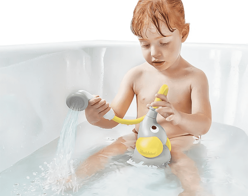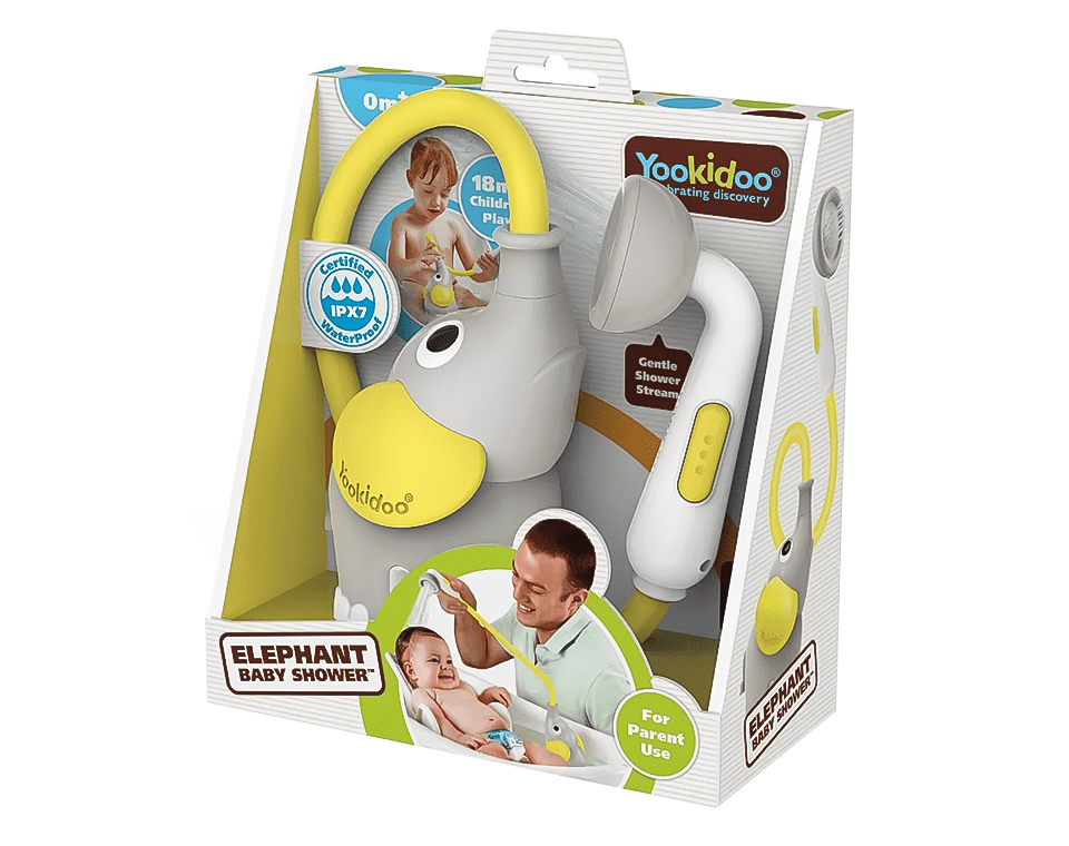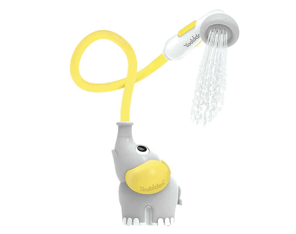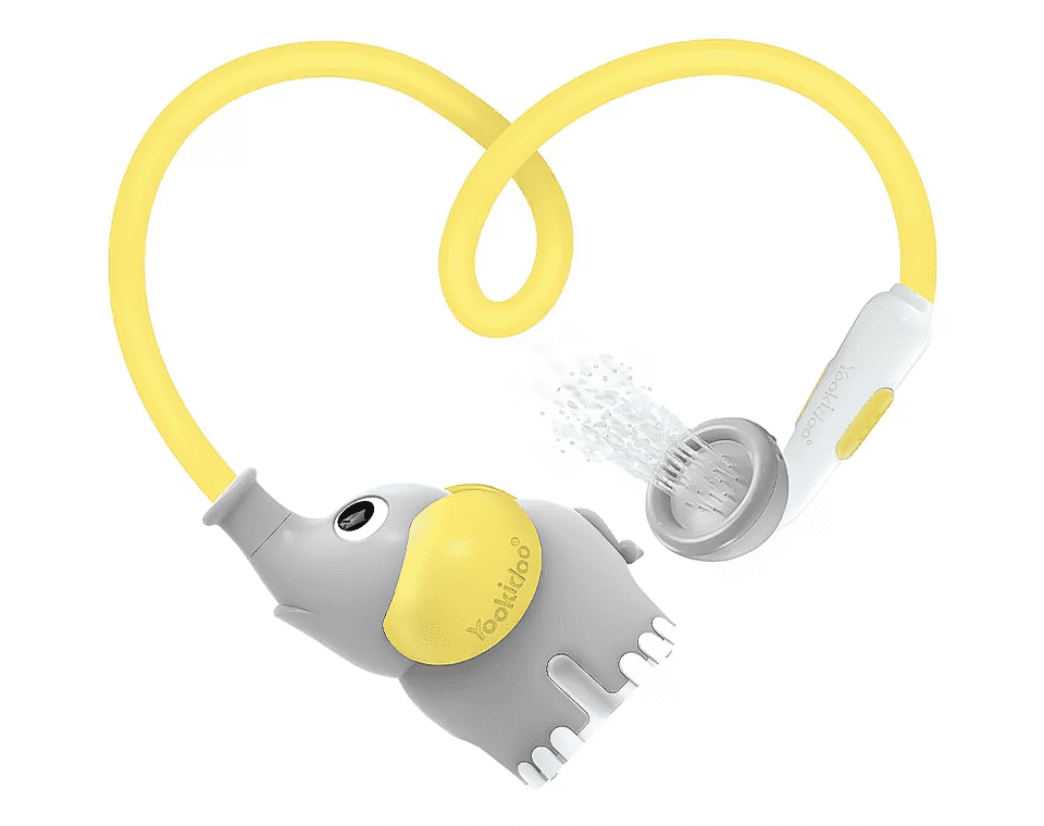 משאבה בצורת פיל מבית Yookidoo, מופעלת ע״י 4 סוללות וצינור גמיש למקלחון המזליף מים בזרם עדין ומאפשר ניקוי התינוק בצורה בטוחה ונעימה.