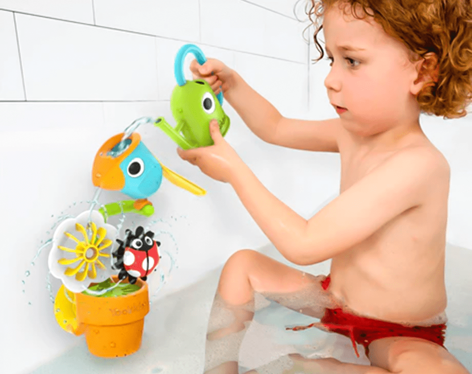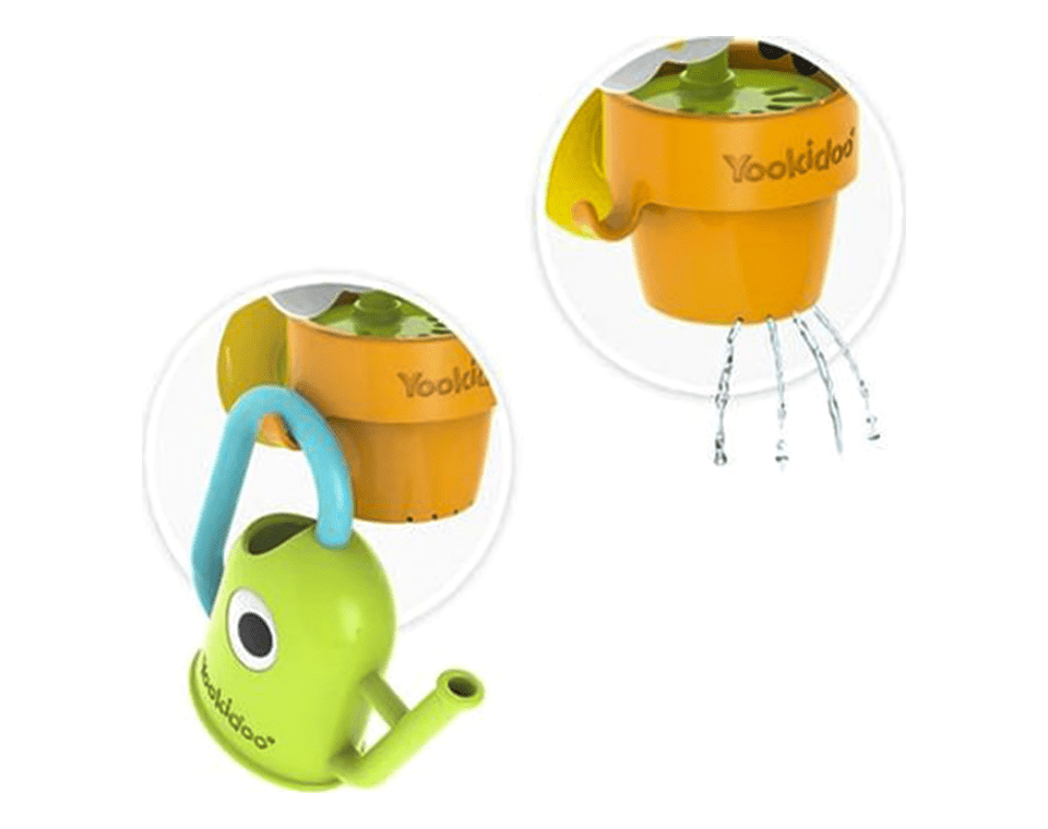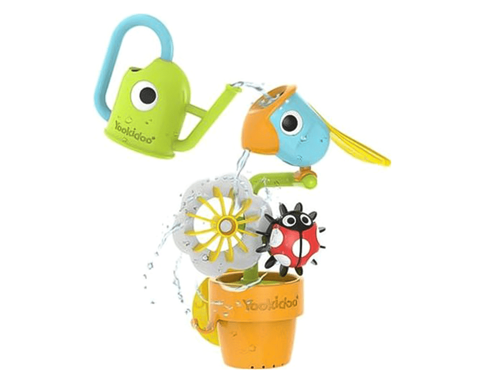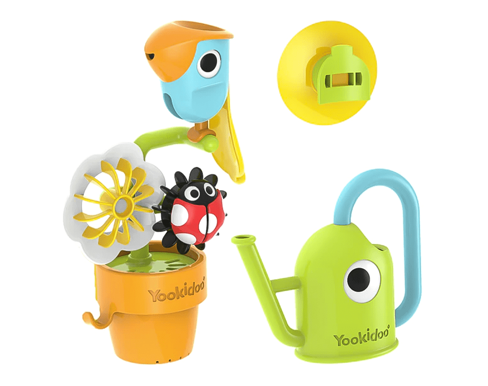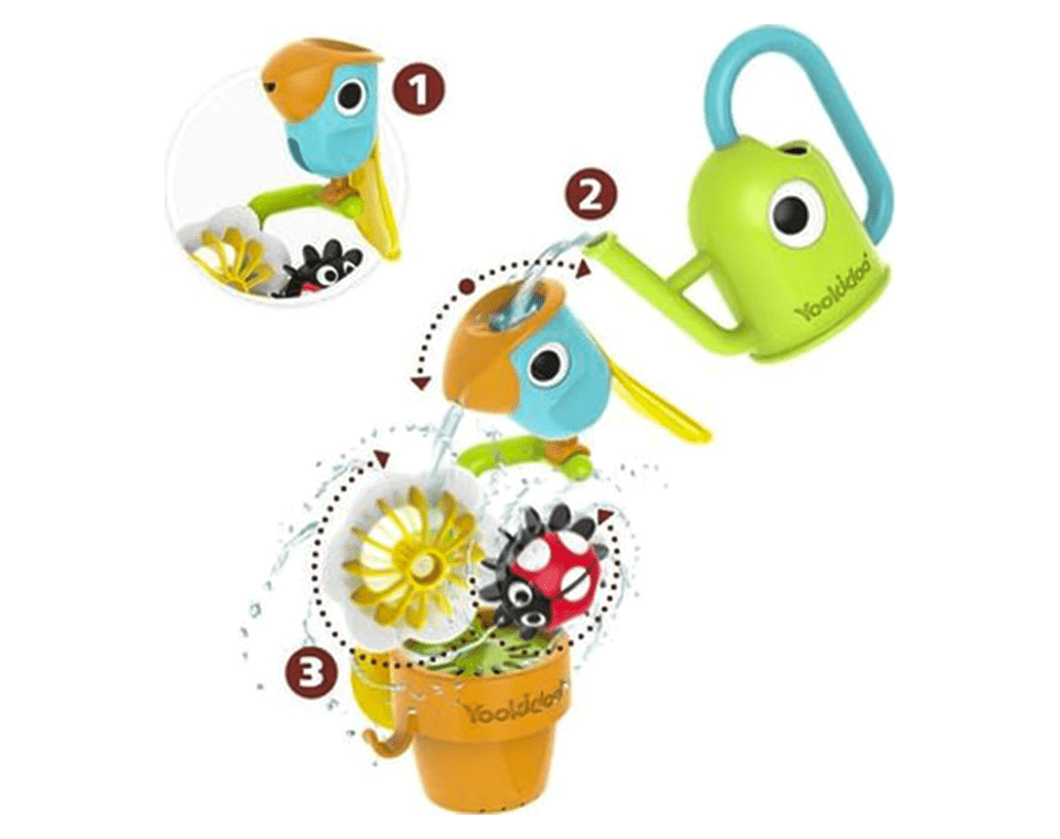 משחק אמבטיה ציפור גלגלי מים מבית Yookidoo. שפכו מים לתוך הציפור, ואז צפו כיצד הציפור מתכופפת ומשקה את הפרח ואת פרת משה רבנו, וגורמת להם להסתחרר.