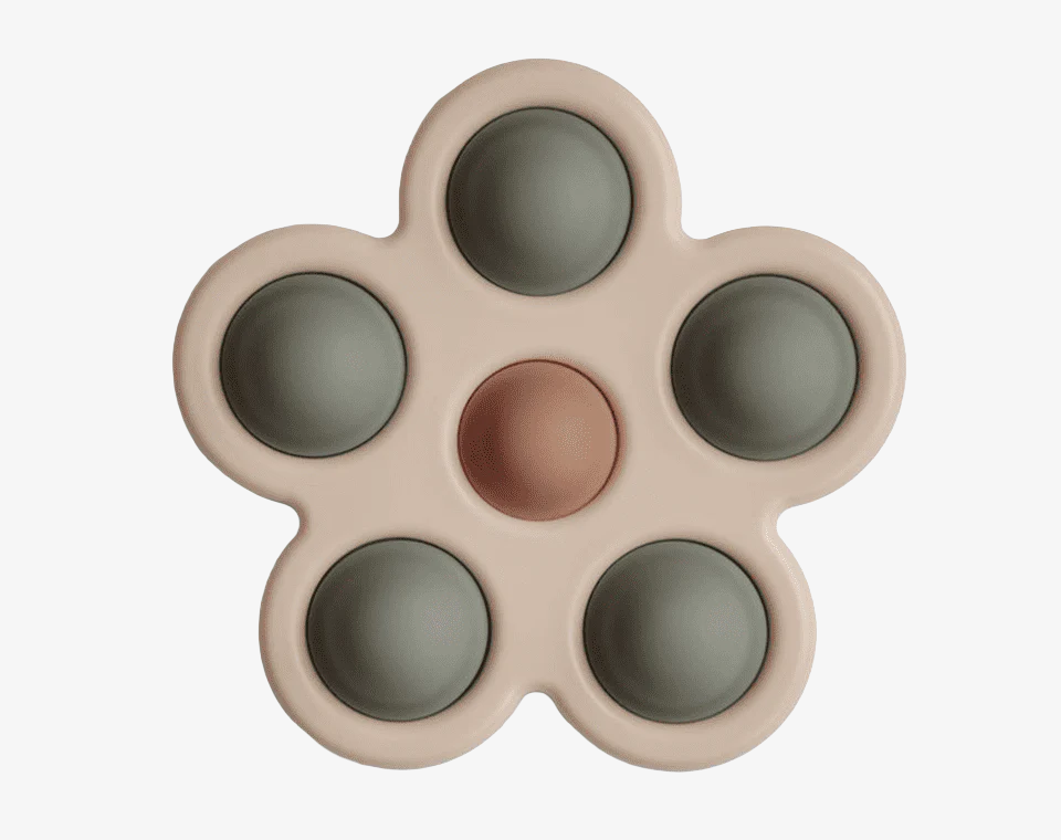 צעצוע לחיצה בצורת פרח מבית מושי מיוצר תוך התחשבות בידיים קטנות מעודד חקר חושי ופיתוח מיומנות מוטוריקה עדינה עם עיצוב נקי וקלאסי בצבעים רכים