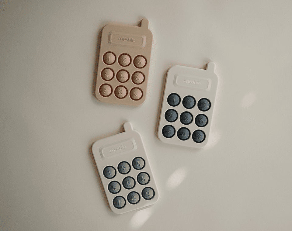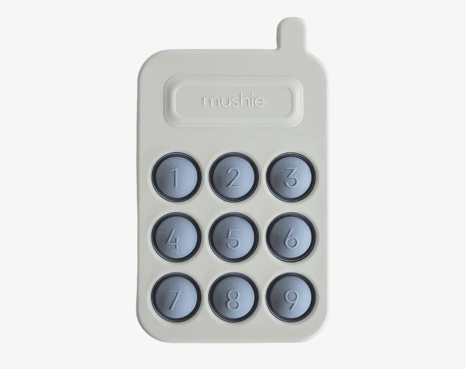 צעצוע לחיצה בצורת טלפון מבית מושי מיוצר תוך התחשבות בידיים קטנות מעודד חקר חושי ופיתוח מיומנות מוטוריקה עדינה עם עיצוב נקי וקלאסי בצבעים רכים