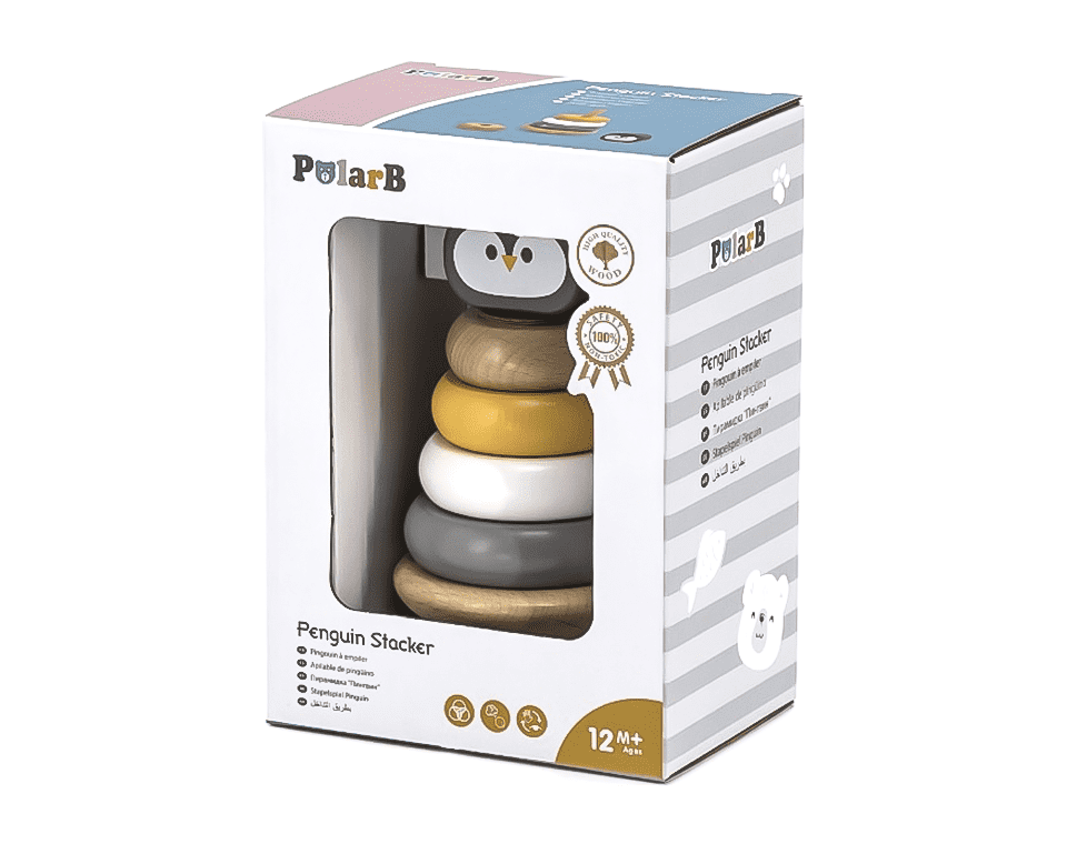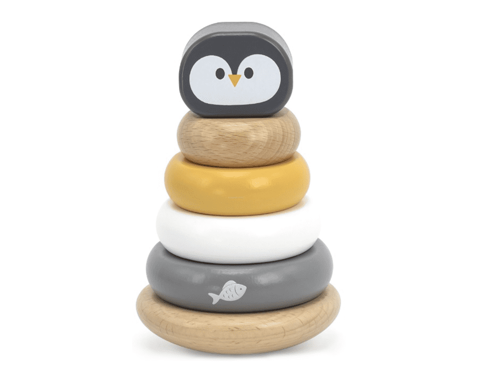 הסט כולל בסיס עם מוט, ארבעה טבעות וראש פינגווין, עשוי עץ מלא וצבוע בצבעים שאינם רעילים.