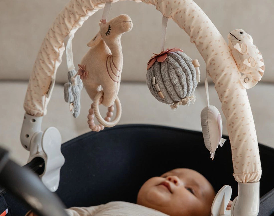 צעצוע טוב לעגלה צריך לשלב צבעים, מרקמים וצלילים לגירוי חושי. הוא צריך לעודד הושטת יד ותפיסה, לחזק קוורדינציה, לשמור על סקרנות ועניין בזמן הנסיעה.