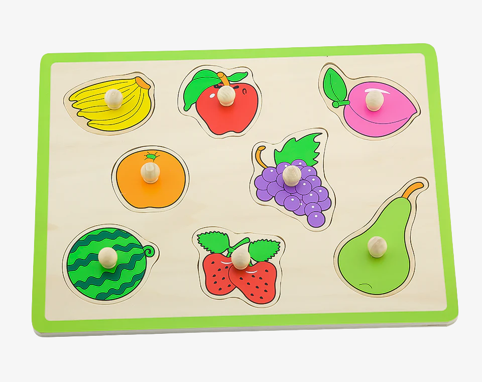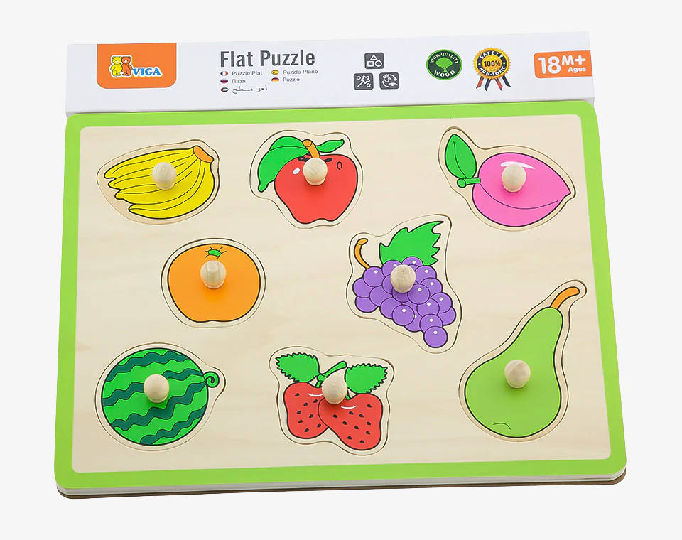 פאזל כפתורי עץ מבית VIGA, העוזר ללמד את ילדכם על פירות, צבוע בעבודת יד ובעל כפתורי עץ כדי להקל על הילדים לתפוס את הלוחות ולהתאימם למקומם הנכון