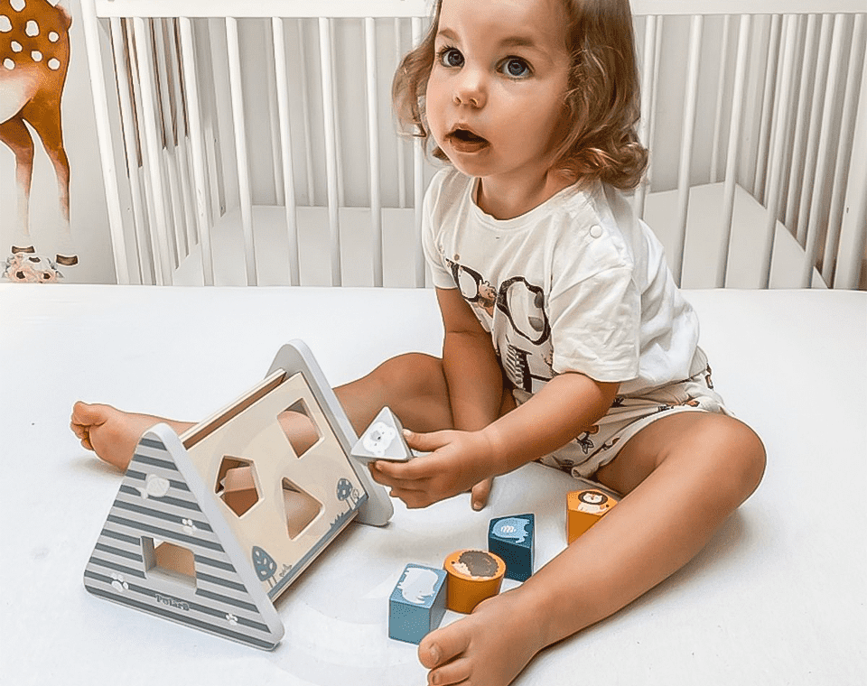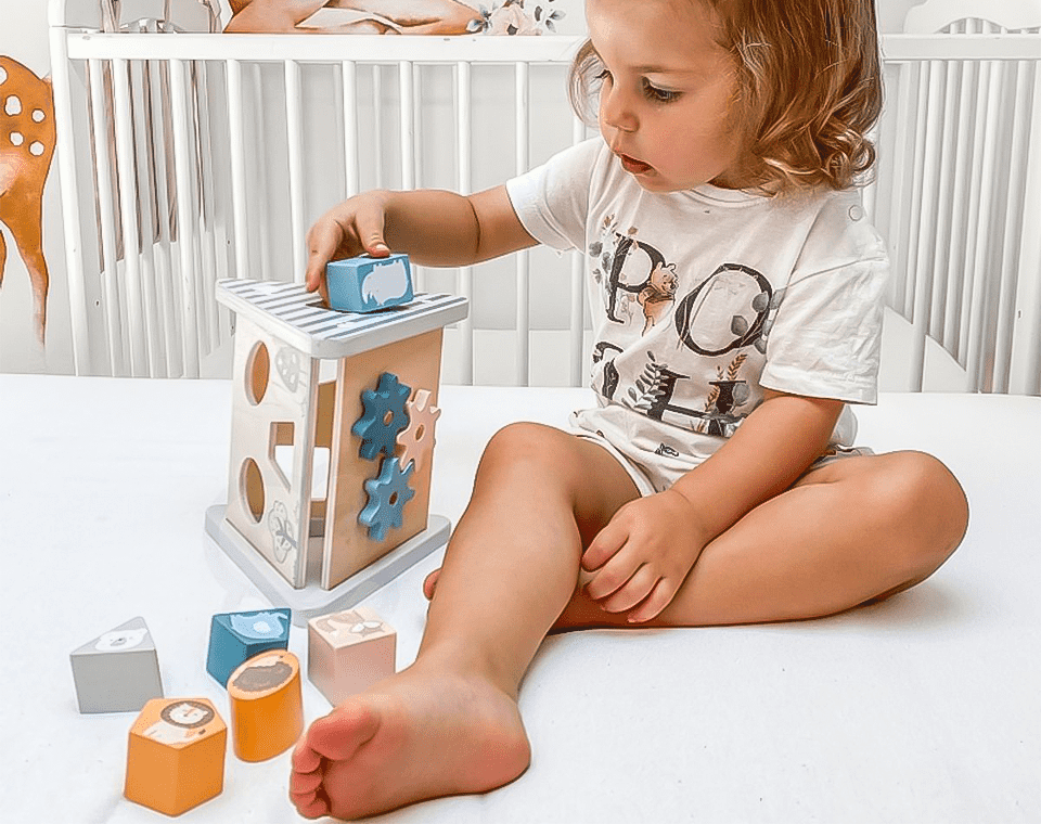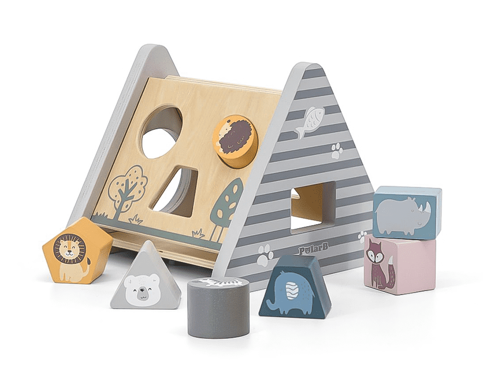 משולש התאמת צורה וגלגלי שיניים מבית ויגה, קופסא משולשת בעלת 5 צדדים עם 7 צורות שונות, מעולה לפיתוח גמישות שורש כף היד, החלקים עשויים עץ איכותי הצבוע בצבעים שאינם רעילים