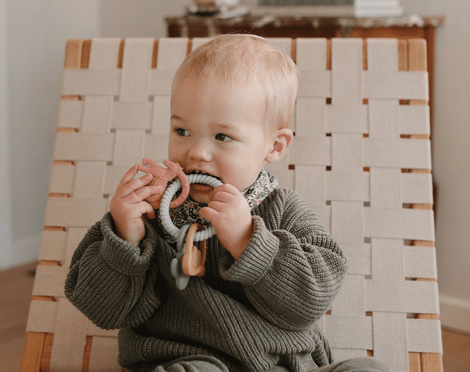 שלושה דינוזאורים חמודים על טבעת סיליקון רכה עם טקסטורת עלים מרגיעה – מושלם להקלה על כאבי חניכיים ולעידוד ההתפתחות החושית. בטוח, גמיש ונוח לאחיזה.