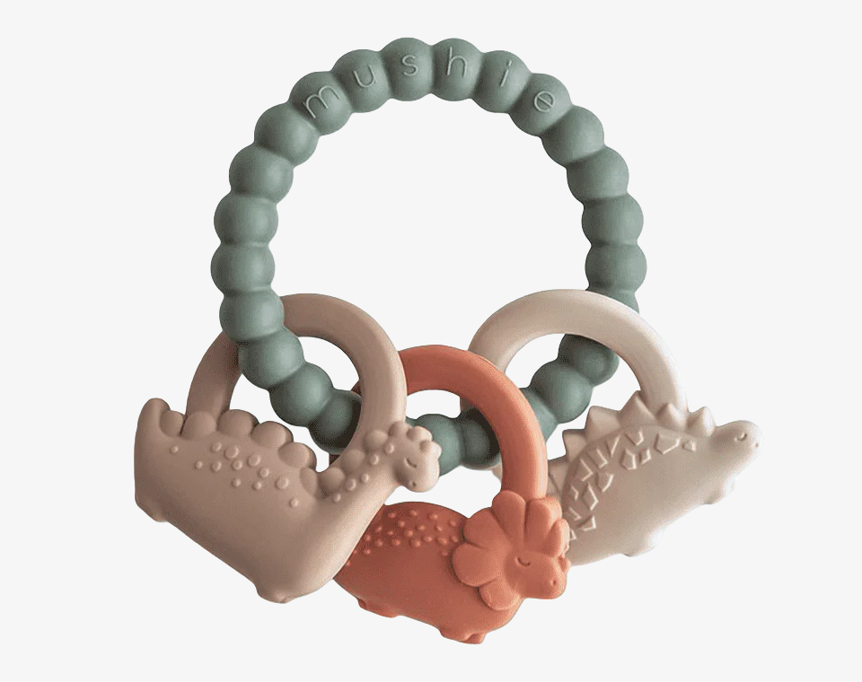 הכירו את נשכן הסיליקון של Mushie בהשראת עולם הדינוזאורים – עם שלוש דמויות מתוקות וצבעוניות על טבעת אחיזה אחת שמתאימה בדיוק לידיים הקטנטנות.