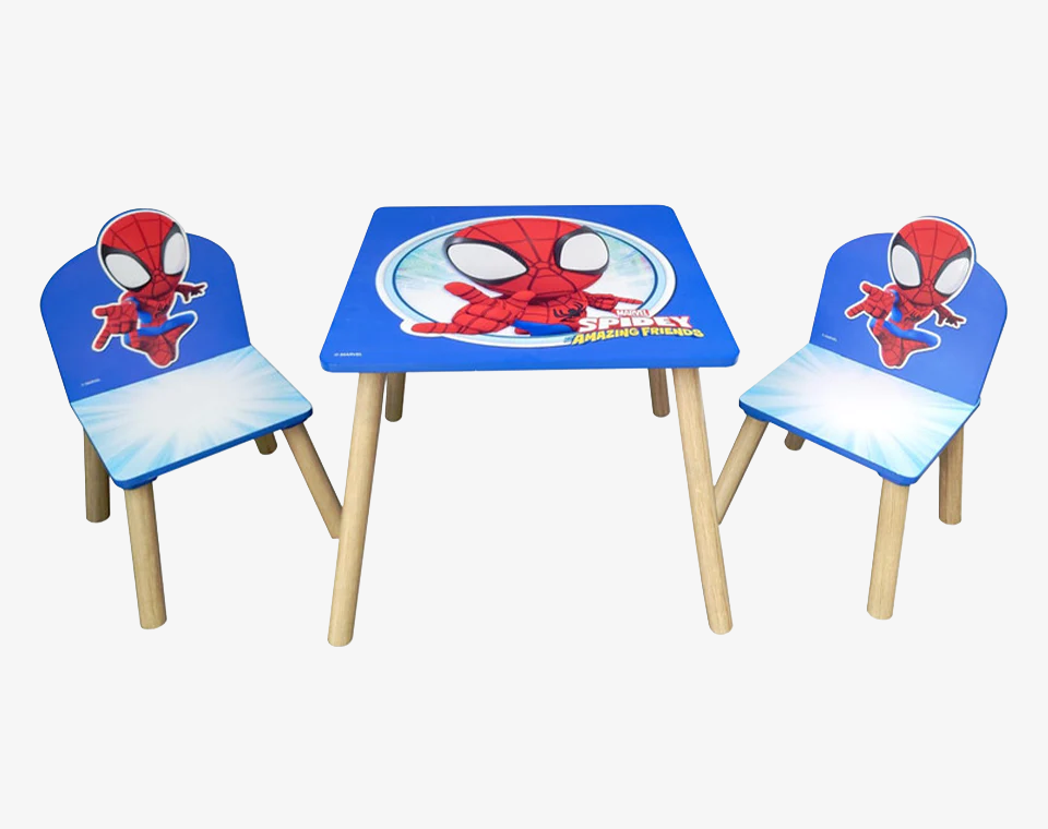 סט ישיבה עם ציורים של הדמות האהובה על קטנטנים ספיידי העכביש הכולל שולחן פעילות ושני כיסאות מעץ