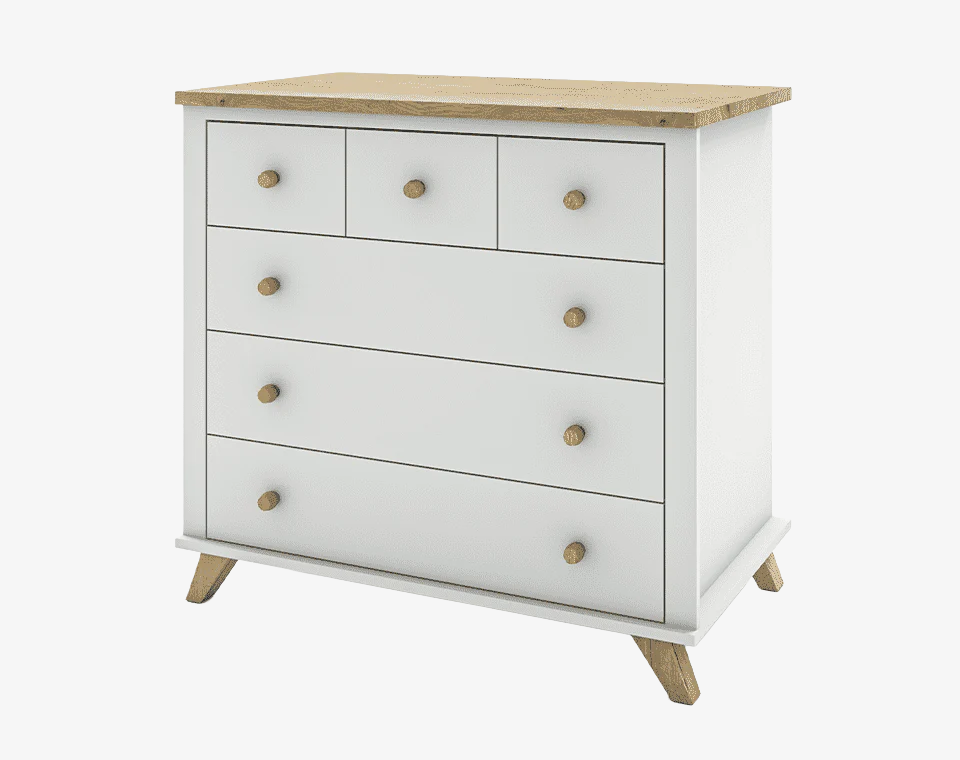שידת אחסנה מעוצבת לחדר תינוקות בצבע לבן בשילוב עץ אלון