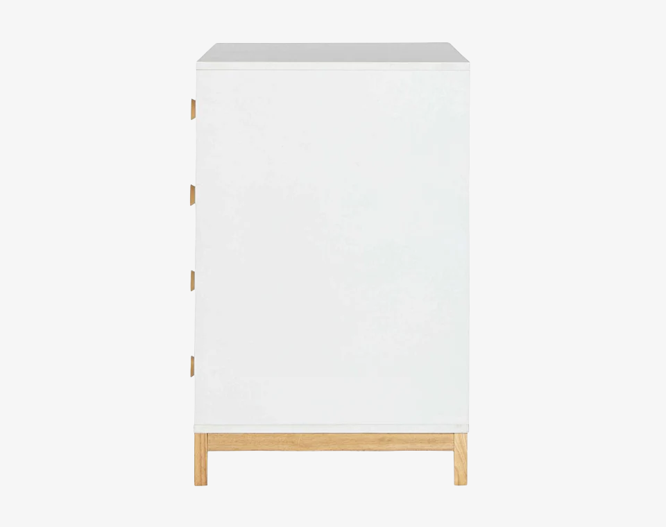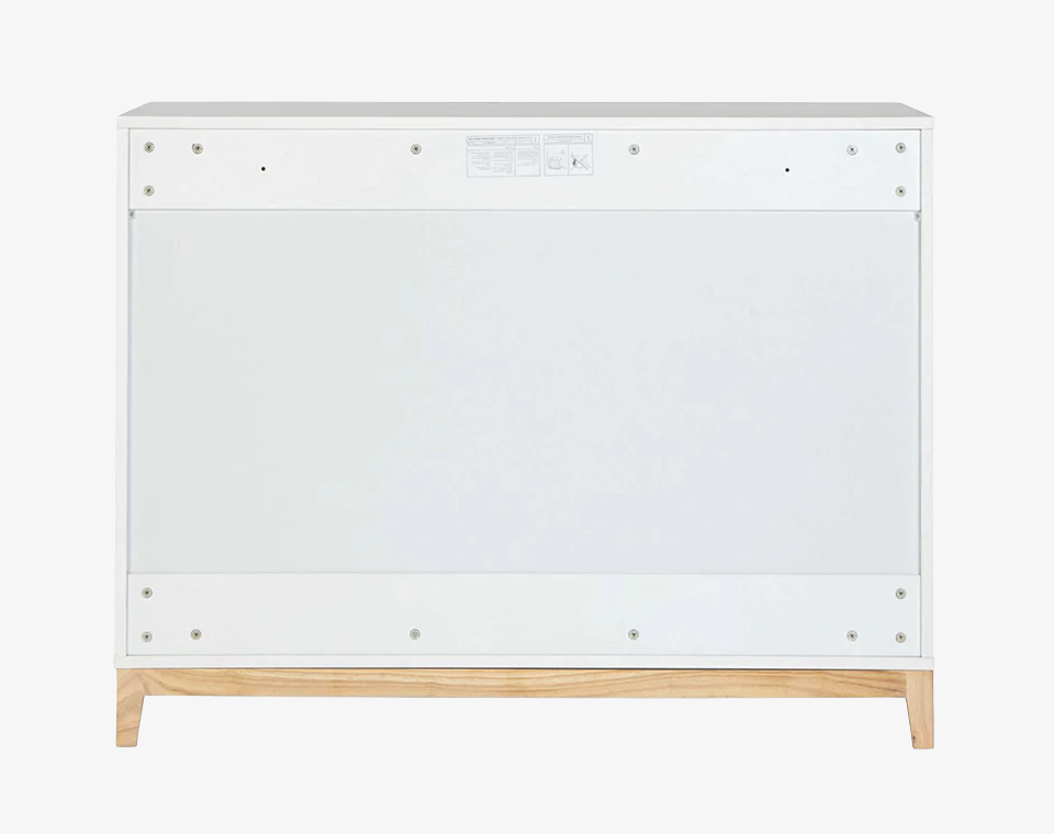 שידה רחבה בגודל 120 ס"מ עם אחסון מירבי בצבעוניות משולבת של גוף לבן עם רגליים וידיות עשויות עץ.