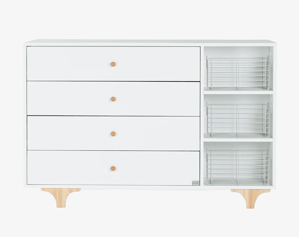 שידה לתינוק ברוחב 140 ס"מ המשלבת את עקרון הפשטות המושלמת עם רגליים מעוגלות שיוצרות עיצוב אינטליגנטי עם סטייל. השידה מעניקה נוכחות אסתטית מרשימה הודות לשילוב עיצובי של תאים פתוחים בשתי פאות : קדמי ובצד השידה וכן אחסון סגור ב 3 מגירות גדולות. השידה כוללת 3 סלסלות בצבע לבן בהם ניתן לאחסן מוצרים של הבייבי בשלב הראשוני, ואחר כך תאים אלה יכולים לשמש אחסון למשחקים וספרים, לבייבי שגדל. הודות לעיצובה ניתן להשתמש בה במשך שנים רבות.