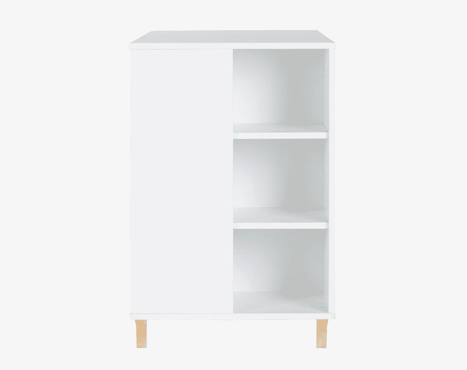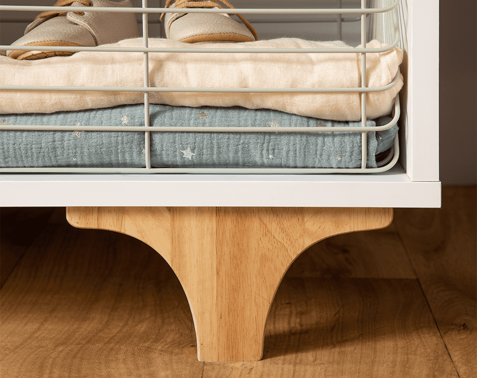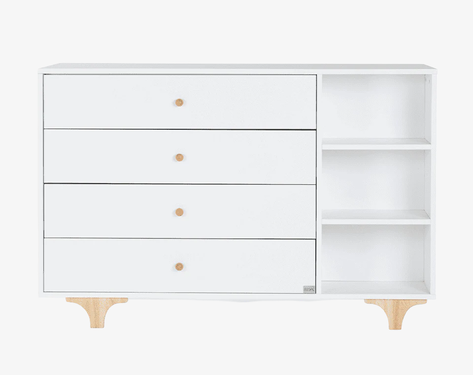 שידה לתינוק ברוחב 140 ס"מ המשלבת את עקרון הפשטות המושלמת עם רגליים מעוגלות שיוצרות עיצוב אינטליגנטי עם סטייל. השידה מעניקה נוכחות אסתטית מרשימה הודות לשילוב עיצובי של תאים פתוחים בשתי פאות: קדמי ובצד השידה וכן אחסון סגור ב 3 מגירות גדולות.