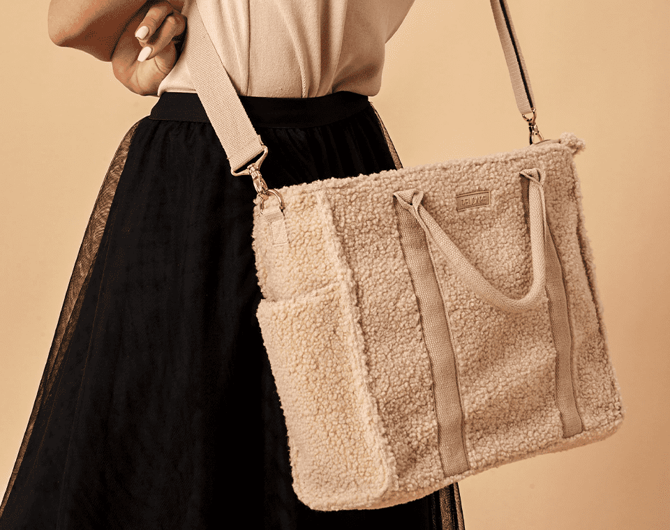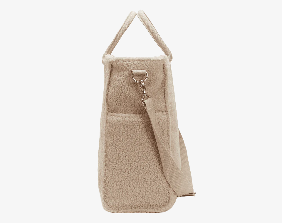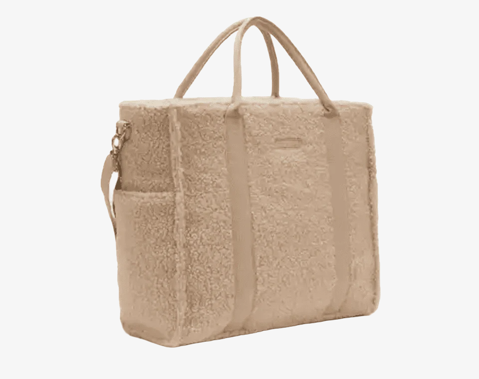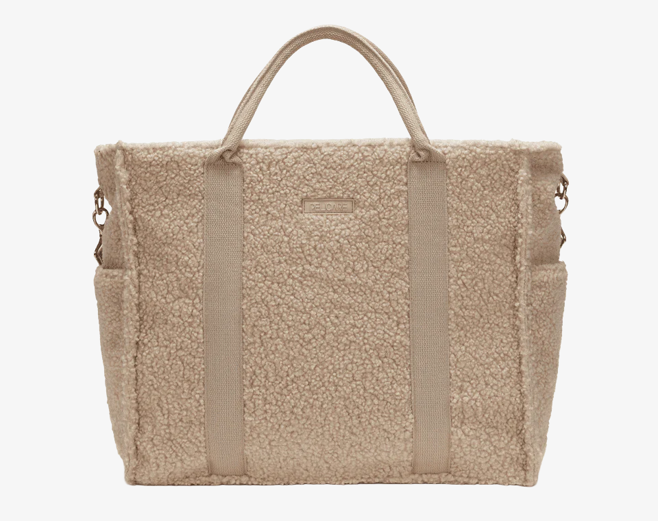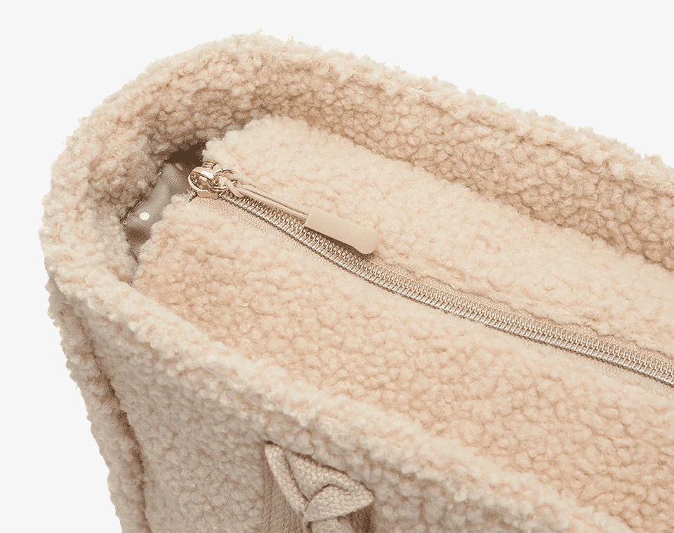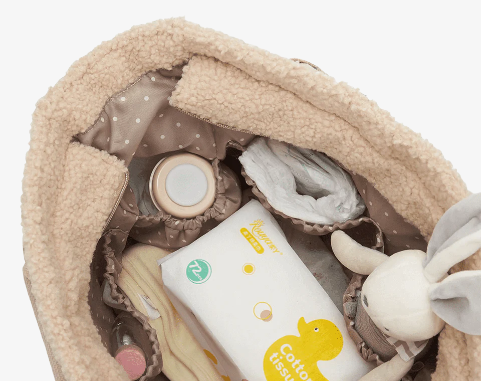 תיק החתלה מבד בוקלה בעל 2 כיסים חיצוניים, 4 תאים פנימיים ו-2 תאים פנימיים לבקבוק.