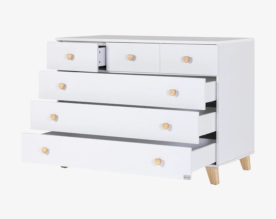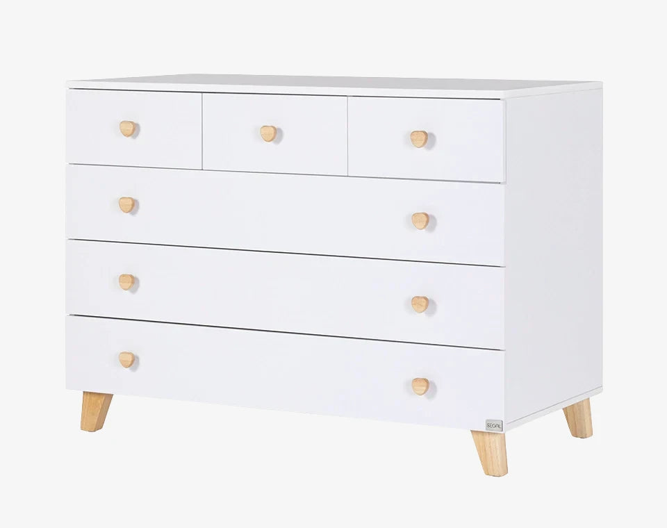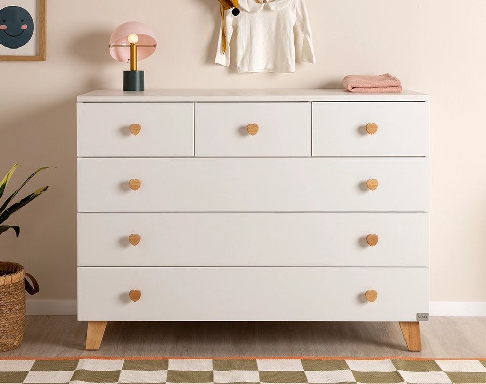 שידה בעיצוב נוסטלגי עם נגיעה רומנטית קלאסית, שידה לתינוק ברוחב 120 ס"מ המשלבת רגלי עץ מלא מעוצבות ומראה נוסטלגי אלגנטי, המתאים במיוחד לחדר תינוקות בסגנון קלאסי, בגימור סופר גלוס וידיות בצורת לב.