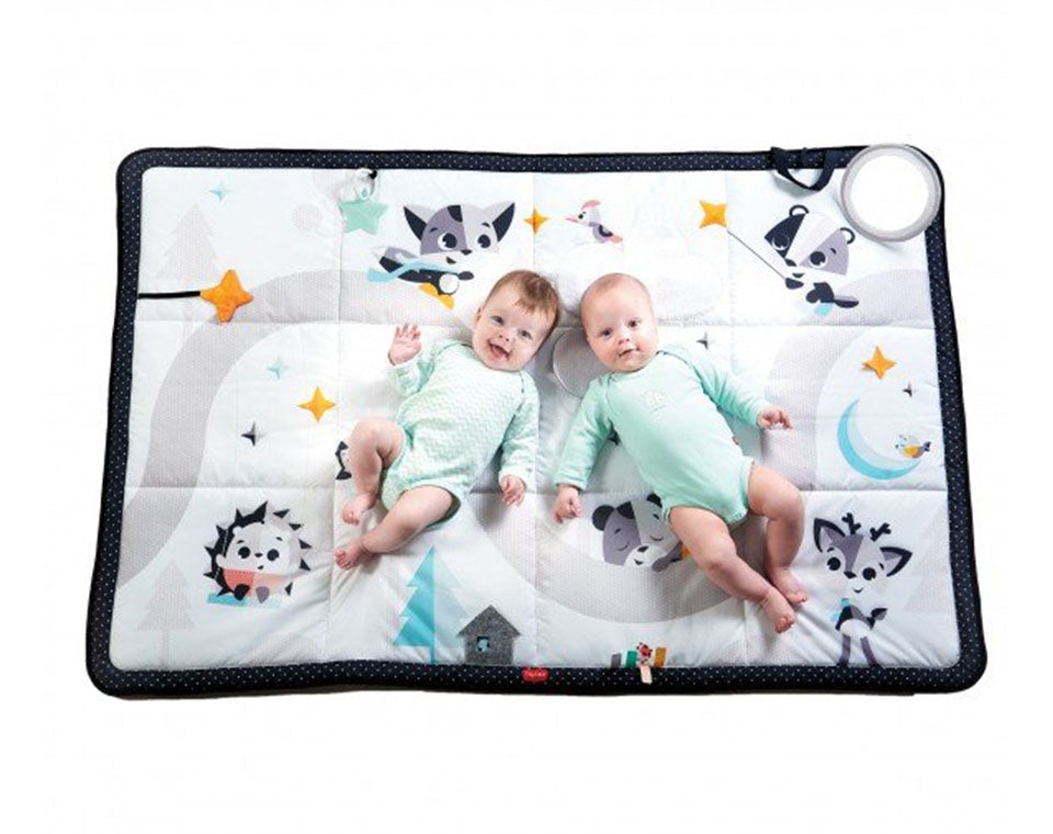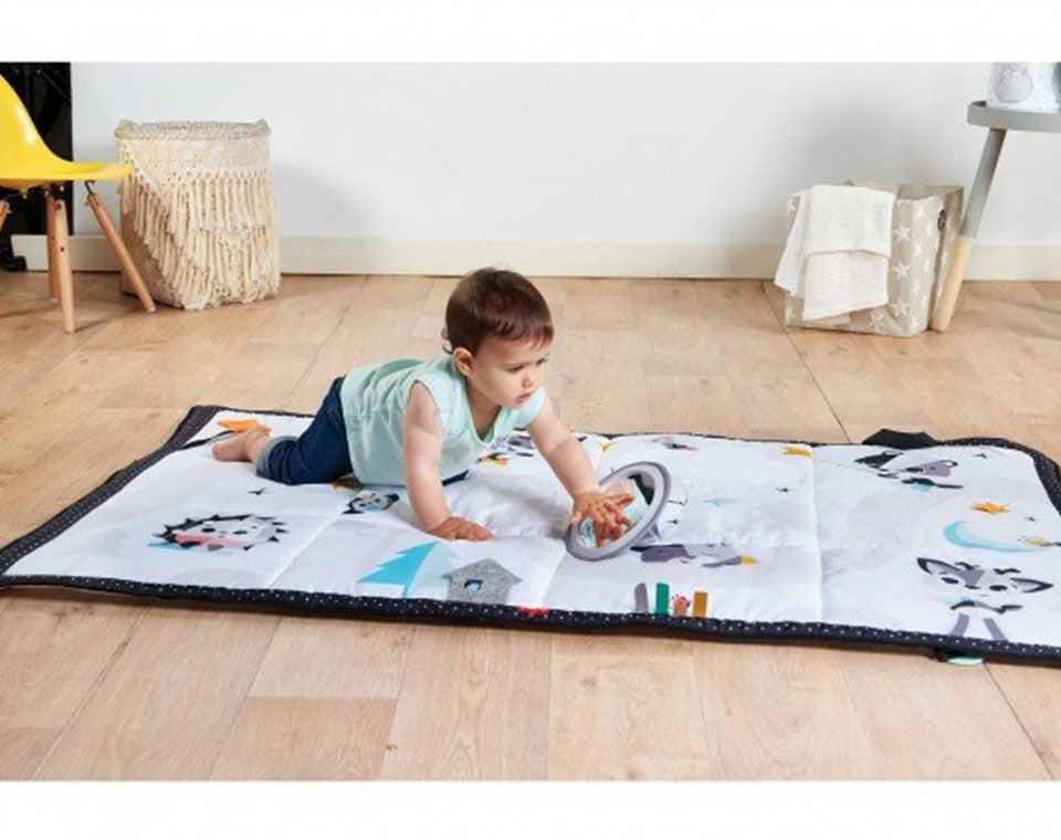 שמיכת פעילות גדולה בעיצוב מושלם בצבע שחור ולבן עם מגוון מרקמים, פעילויות ומראה ניידת. מספקת מרחב נוח לתינוק להפעלת גופו וחיזוק שריריו וכן מקום גדול ונוח להורה לשכב או לשבת לצדו