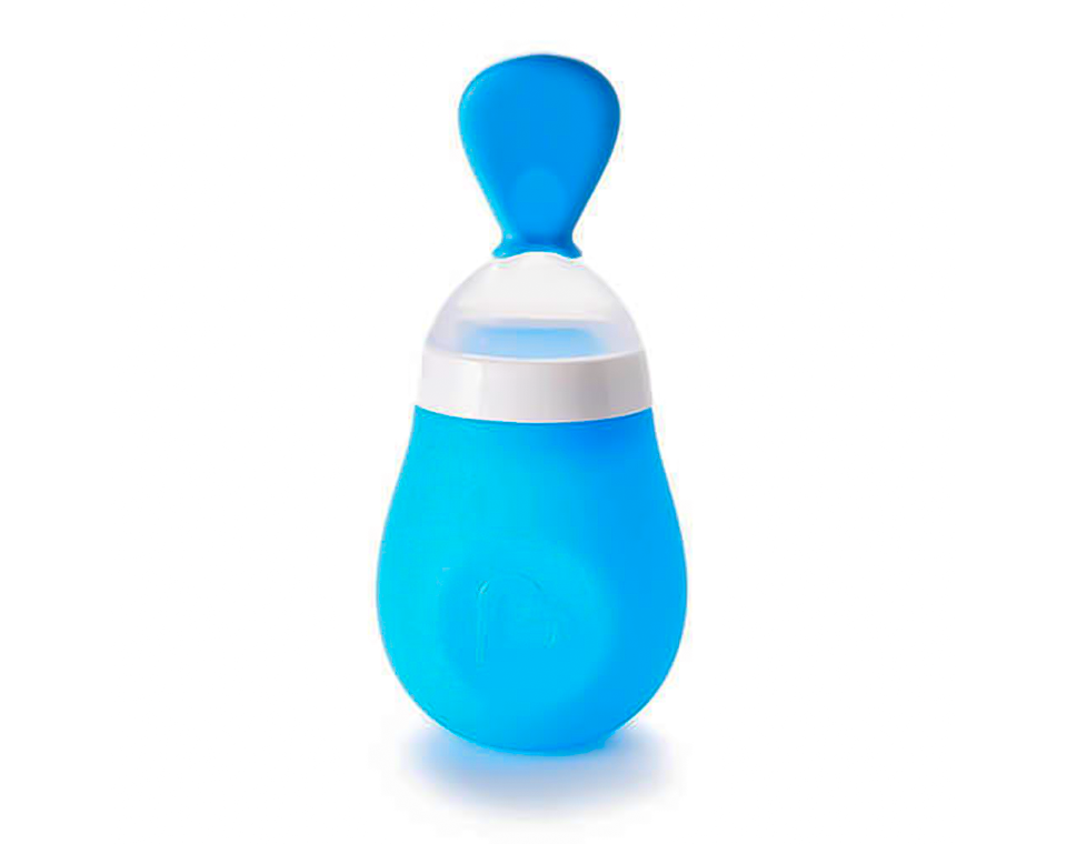 בקבוק רך עם כפית להאכלה בלחיצה מבית מנצקין, מכסה תואם מגן על הכפית בקצה המיכל.