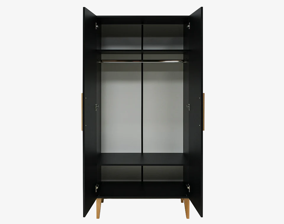 ארון המשלב עץ בוק טבעי ו- MDF, אירופאי איכותי בצבעי שחור/טבעי, עם ידיות עץ בוק טבעי אופנתיות. אחסון נוח עם מוט תליה מתכוונן ומדפים