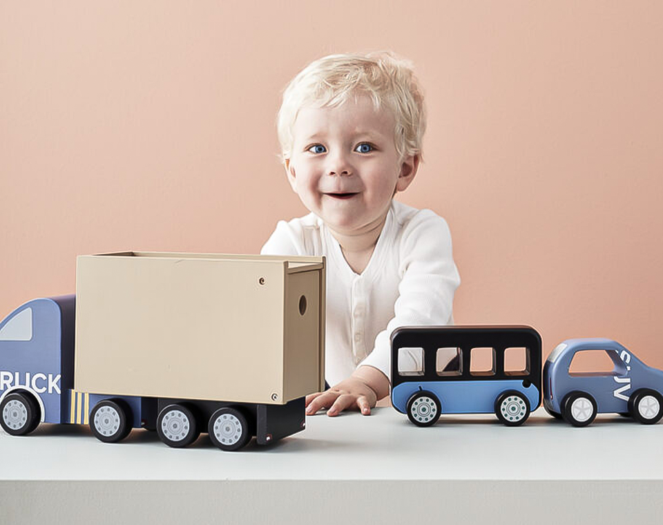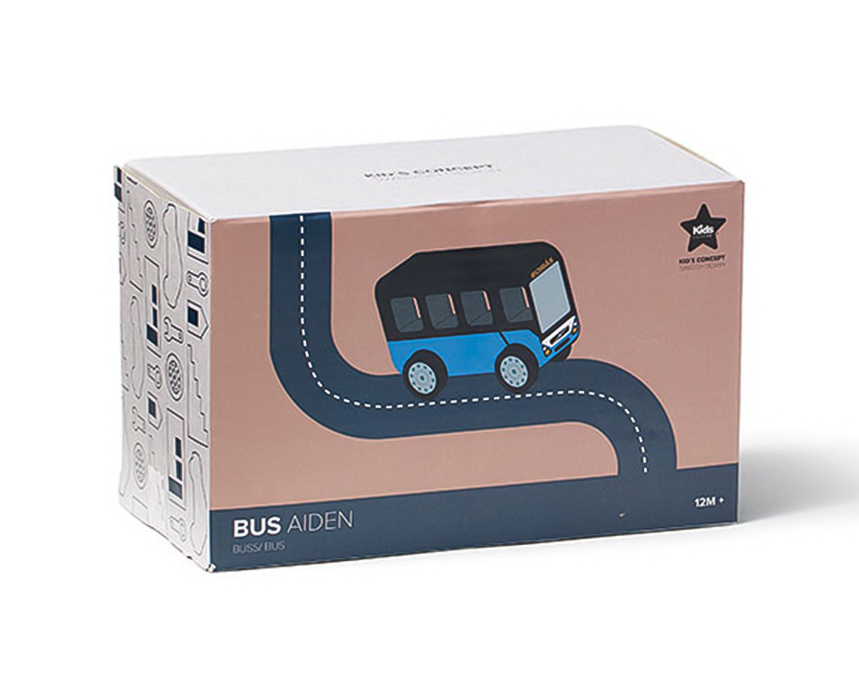 אוטובוס עירוני מעץ כולל חור קטן למיכל גז, כחלק מקולקציית הצעצועים AIDEN.