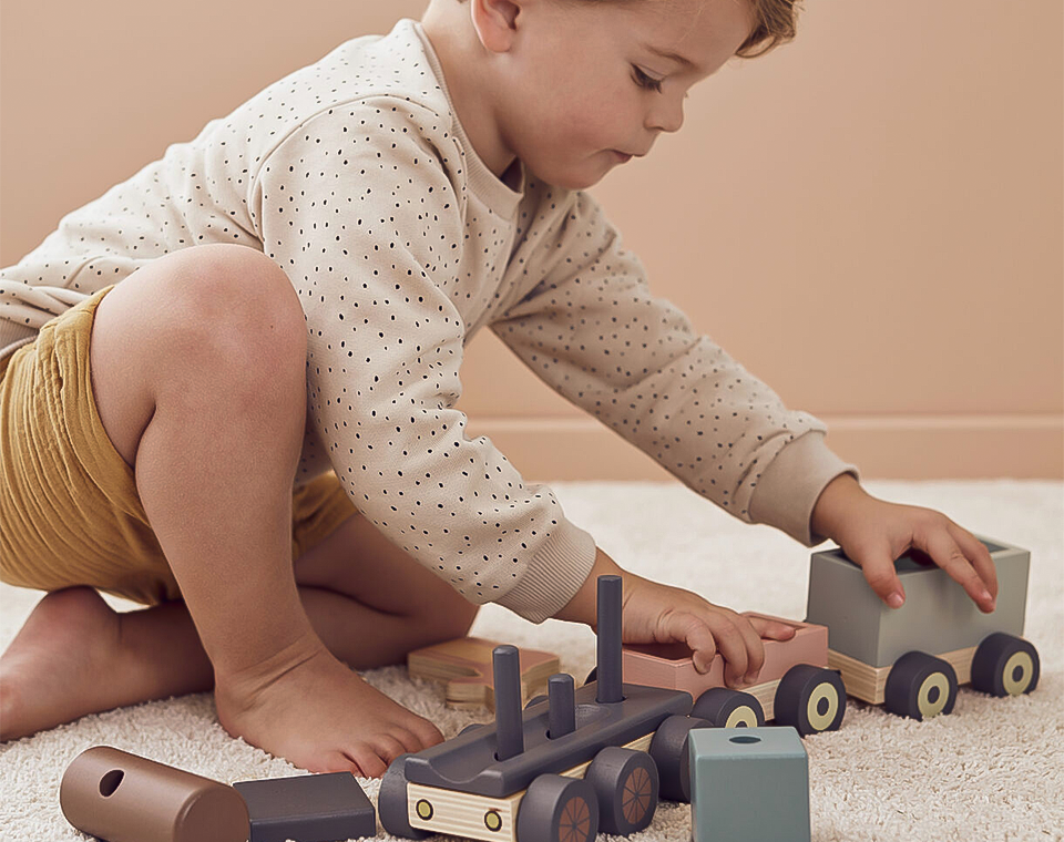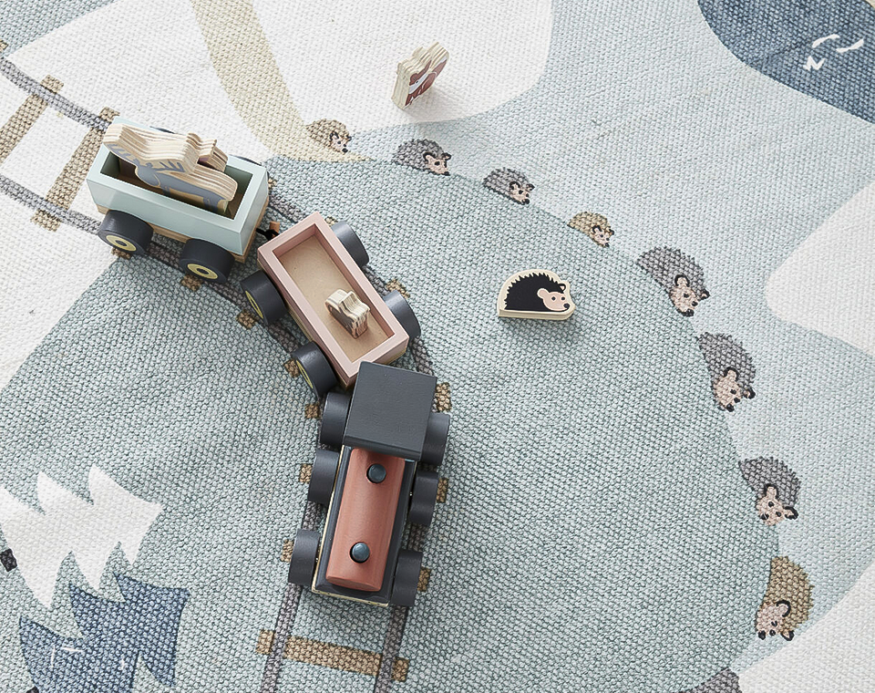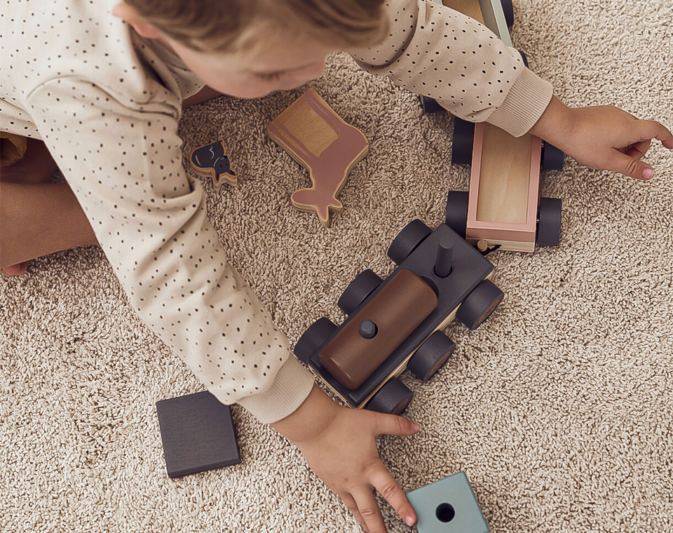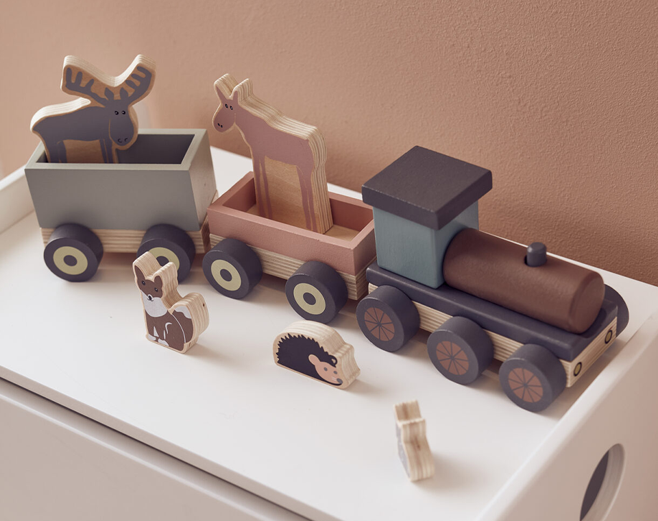 רכבת עץ עם קטר, ושתי קרונות הניתנים לחיבור ולניתוק בקלות.