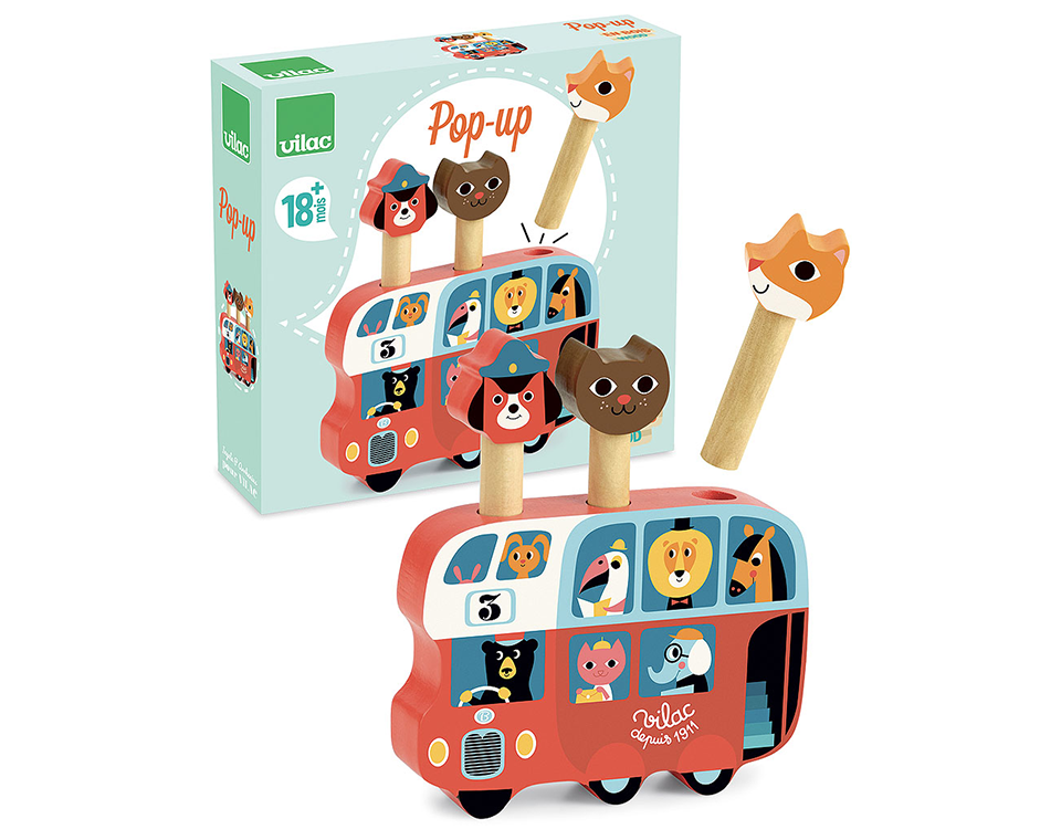 אוטובוס עץ יפהפה מבית Vilac עם תצוגת נוסעים צבעונית.