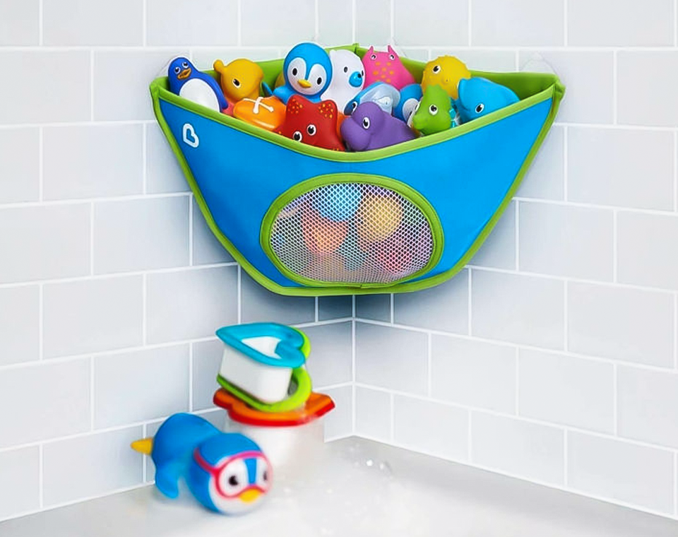 - סל צעצועים לאמבטיה, נתפס בקלוח לאריחי האמבט על ידי 4 דבקיות רב פעמיות