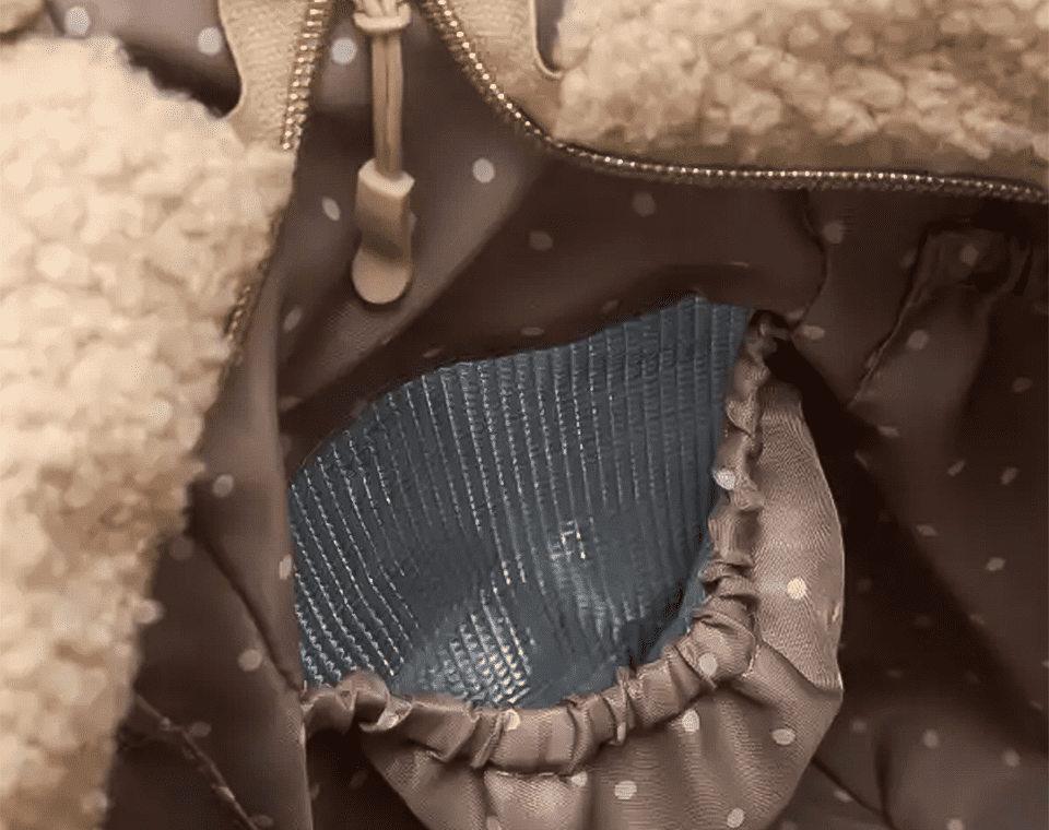 תיק החתלה מבד בוקלה בעל 2 כיסים חיצוניים, 4 תאים פנימיים ו-2 תאים פנימיים לבקבוק.