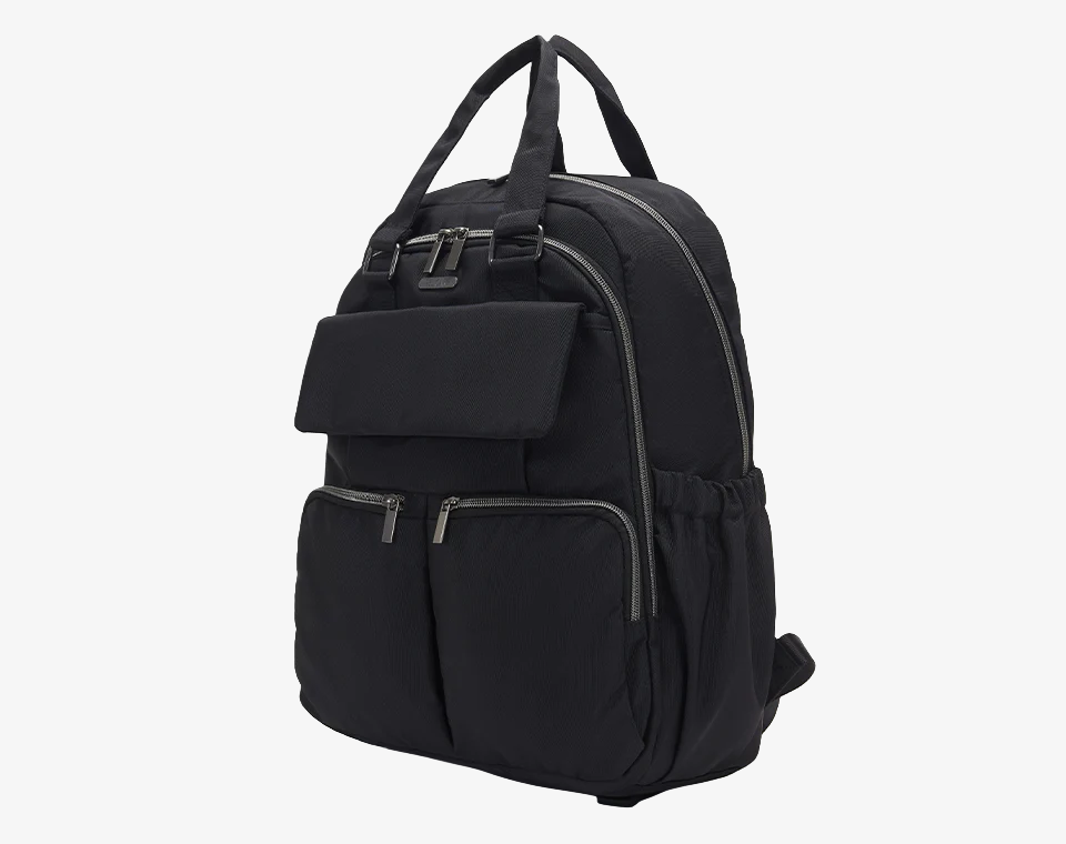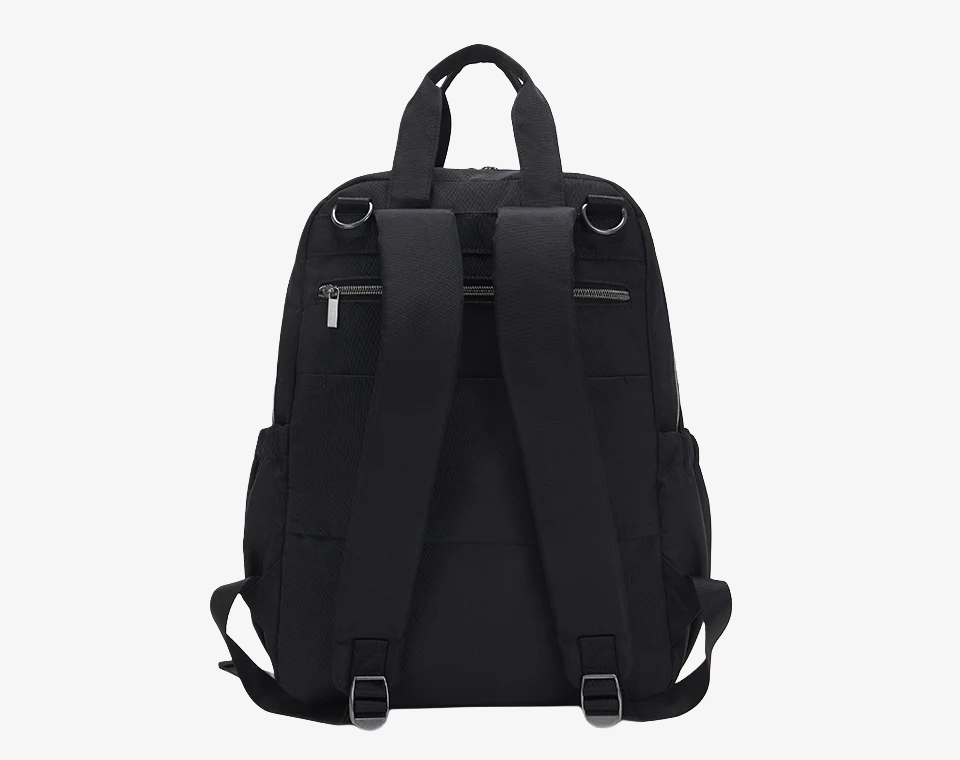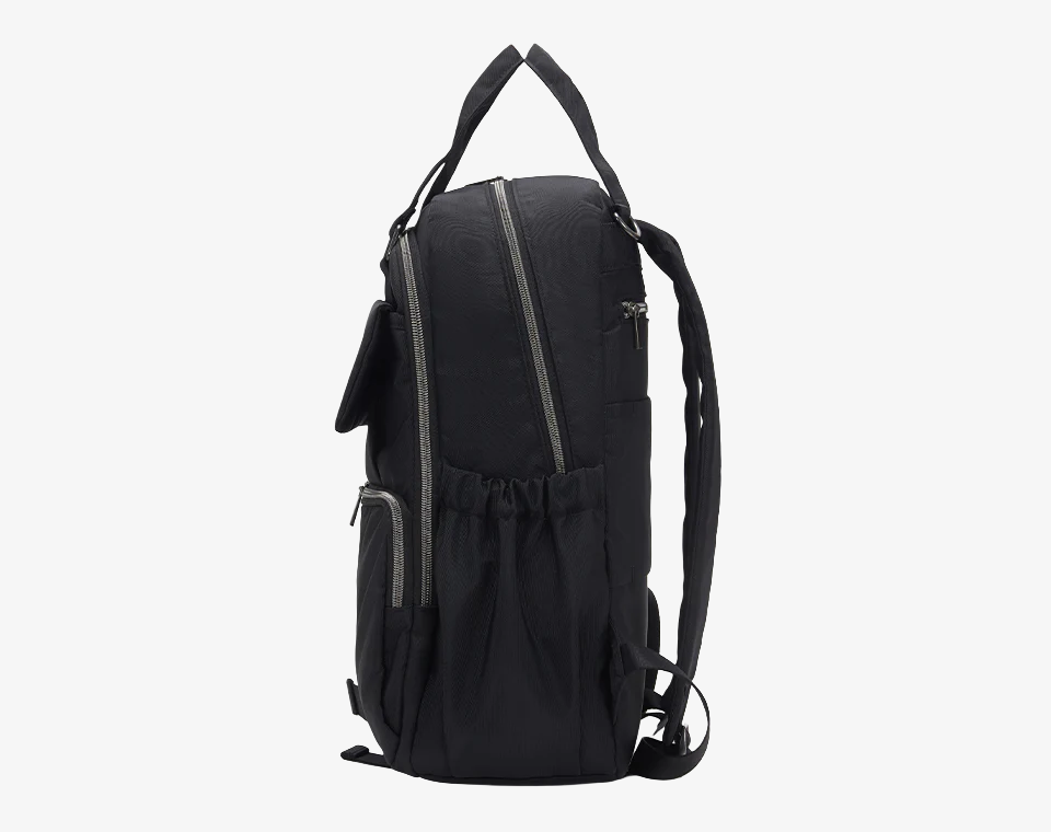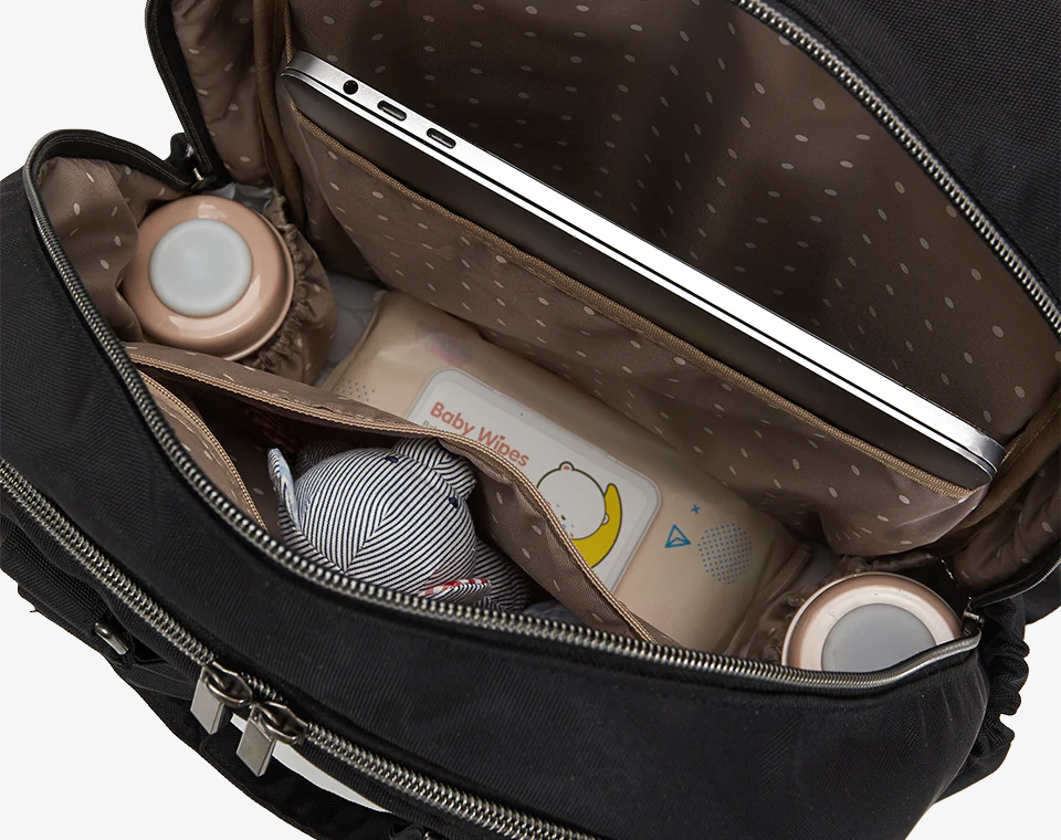 תיק החתלה גב בעל 7 תאים חיצוניים ו-3 תאים פנימיים, תא למחשב נייד ו-2 כיסים פנימיים לבקבוקים.
