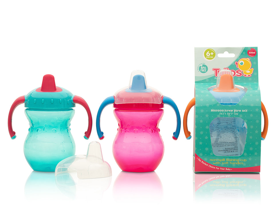 כוס אימון שאינה מטפטפת עם ידיות ופיה רכה אשר מתאימה במיוחד לאימון התינוק לשתיית מים