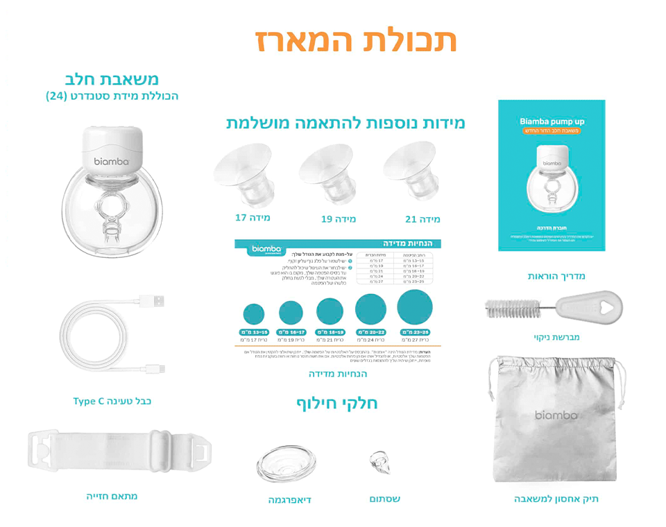 - תכולה: .מתאם חזייה, חלקי סילקון להחלפה +תיק למשאבה +4 מידות נוספות 24/21/19/17 מגן סיליקון, דיאפרגמת סיליקון ,מאסף חלב, חלק מקשר, מנוע משאבה ,שסתום, מטען.