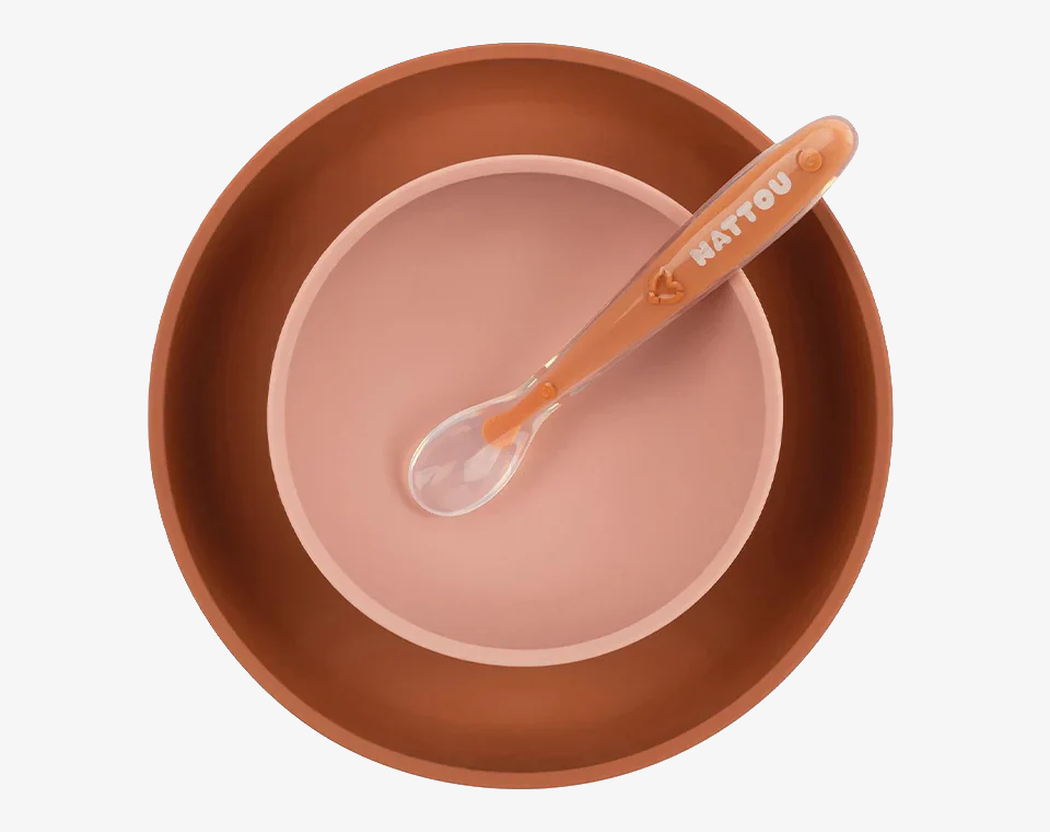 סט כלי אוכל מסיליקון מבית Nattou, כולל בתוכו- צלחת, קערה, כפית וסינר.