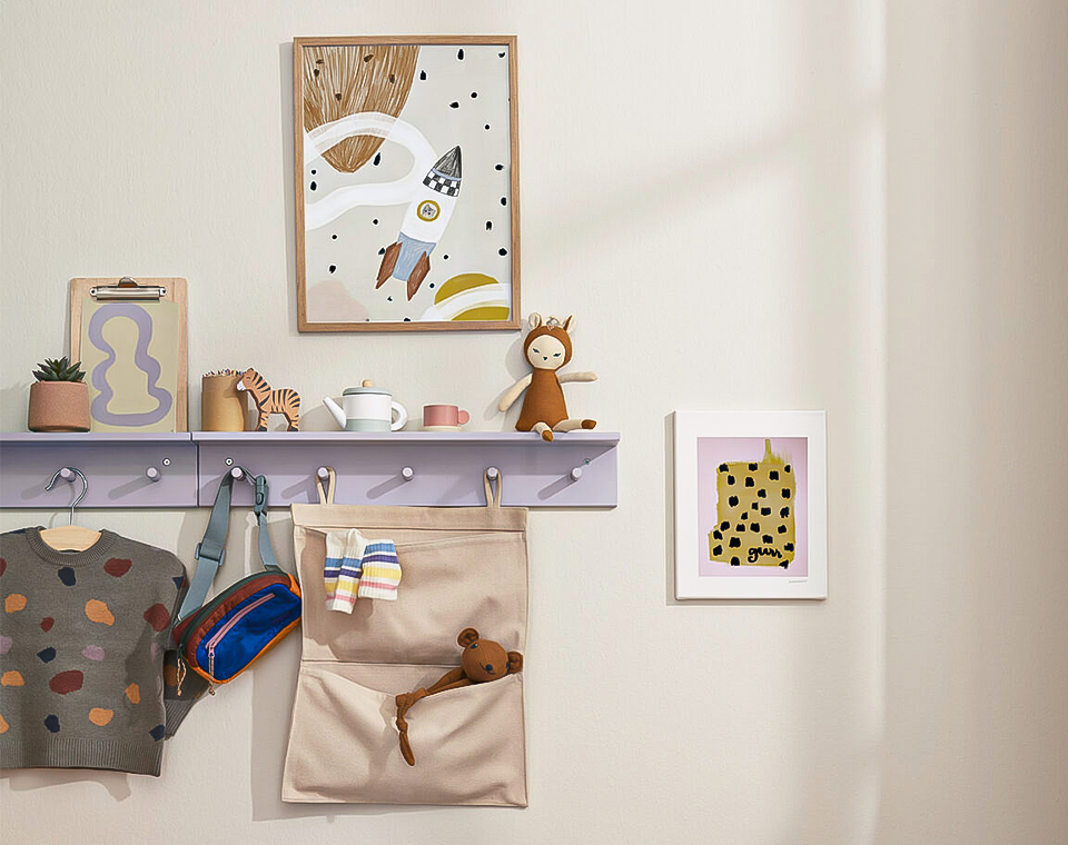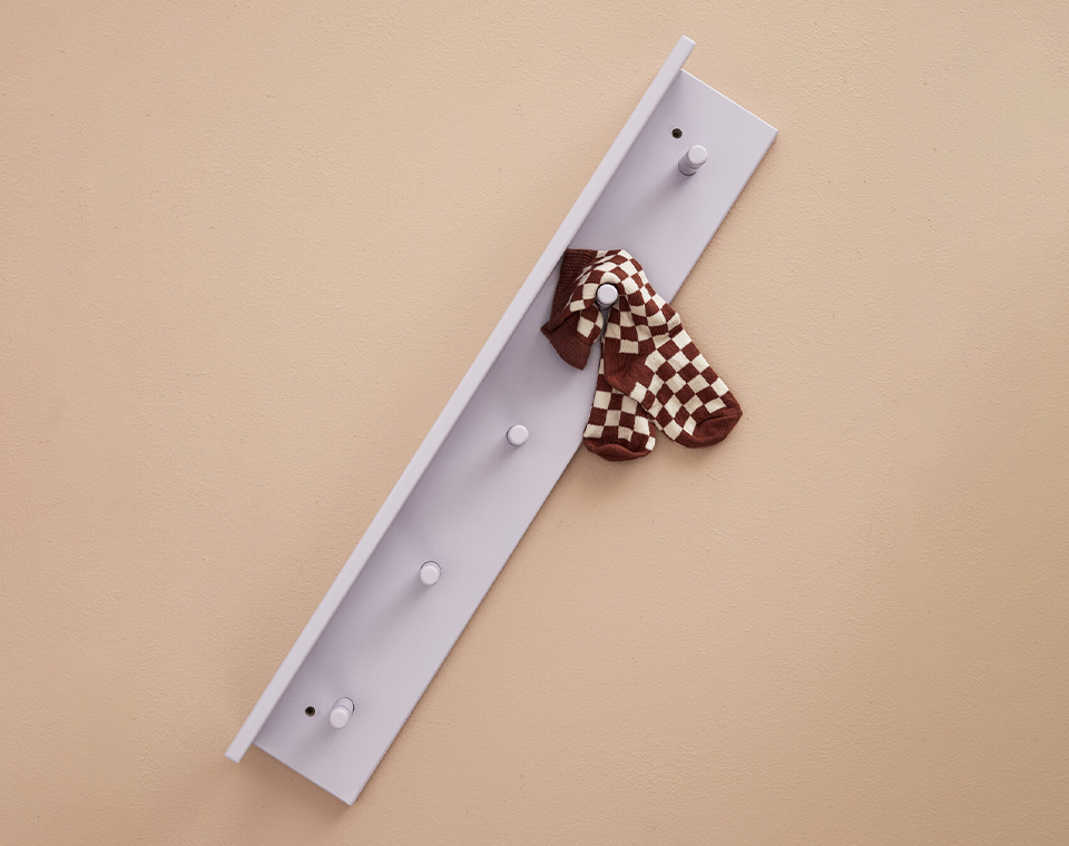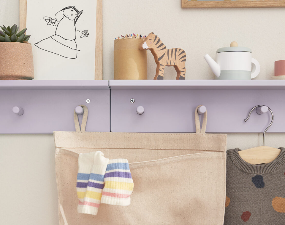 מדף מעץ עם ווי תליה, הווים מפוזרים באופן שווה כך שניתן להציב מספר מדפים אחד ליד השני.