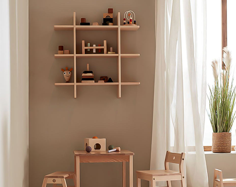 מדף קיר הכולל שלושה מדפים בעיצוב נצחי. קשטו בצעצועים או בפרטי נוי אחרים, כדי לעשות את החדר הכי יפה ומיוחד לקטנטנים שלכם.