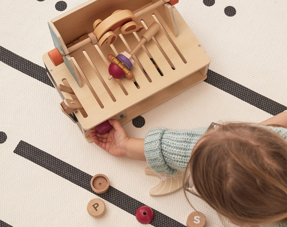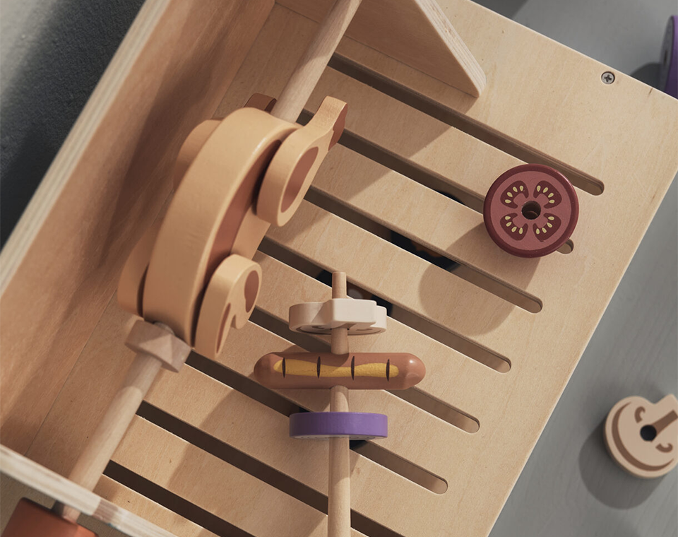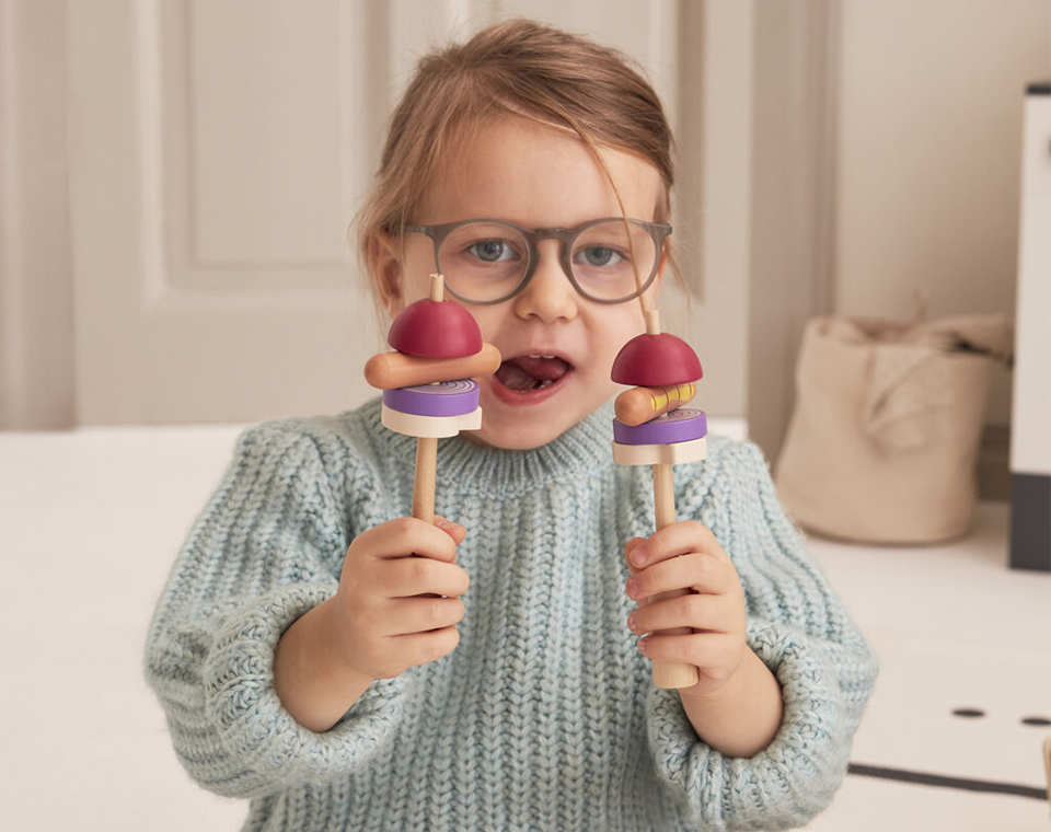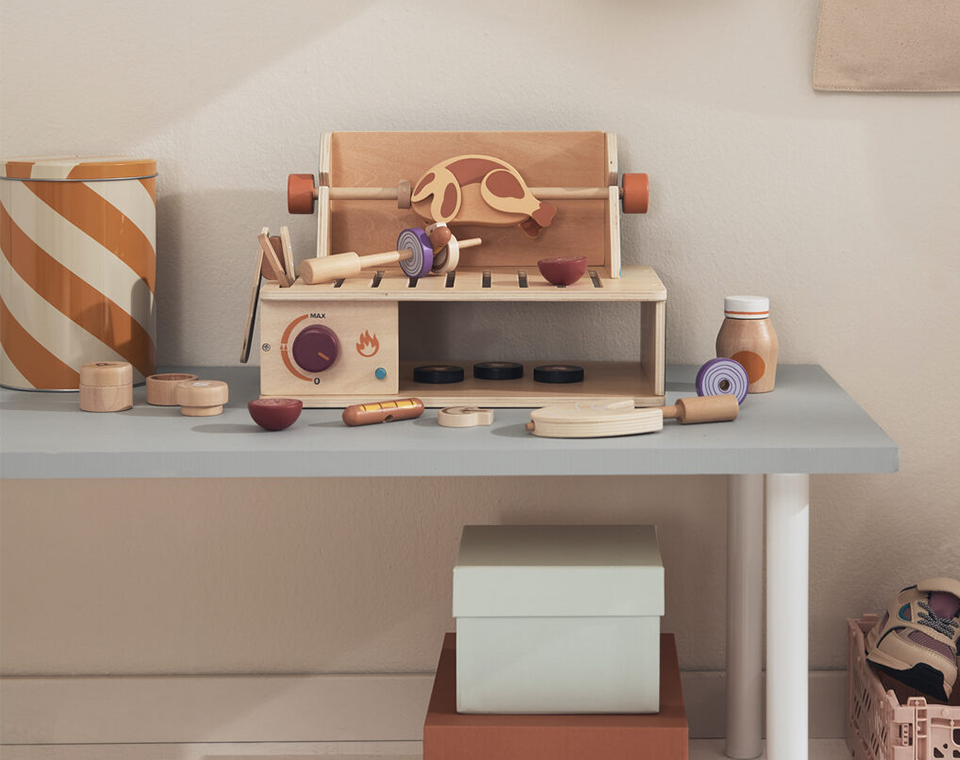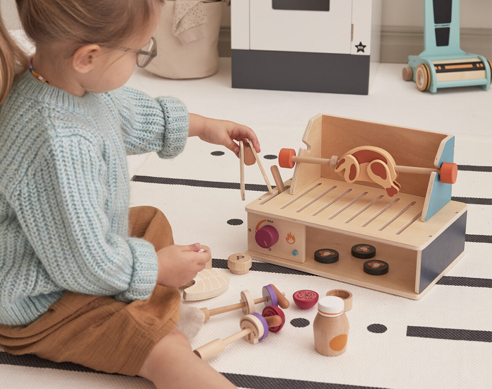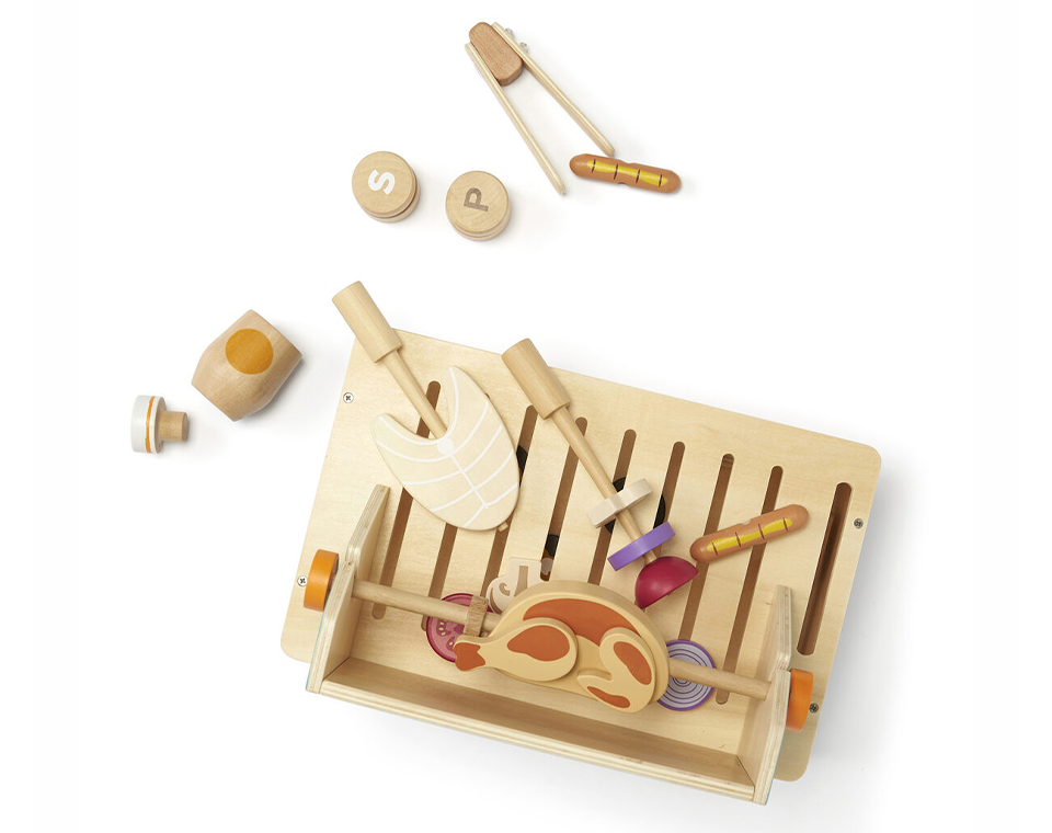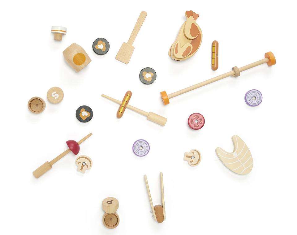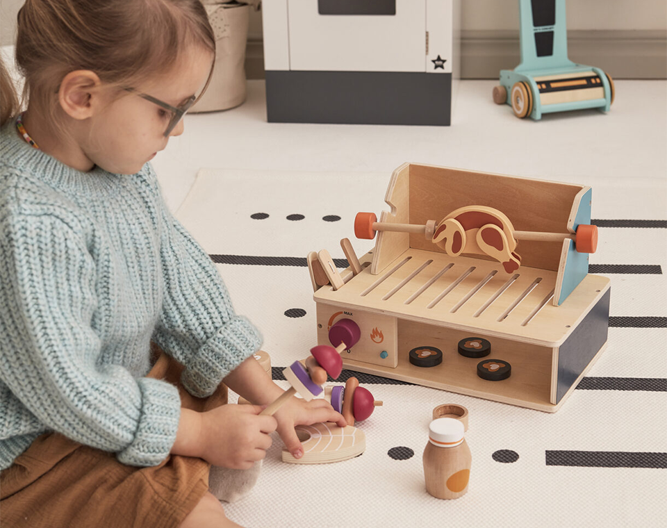 סט ברביקיו מעץ, המספק שעות רבות של משחק מהנה שבו ילדים יכולים להפעיל את דמיונם, לחקות מבוגרים ולשחק בגריל מאסטר.