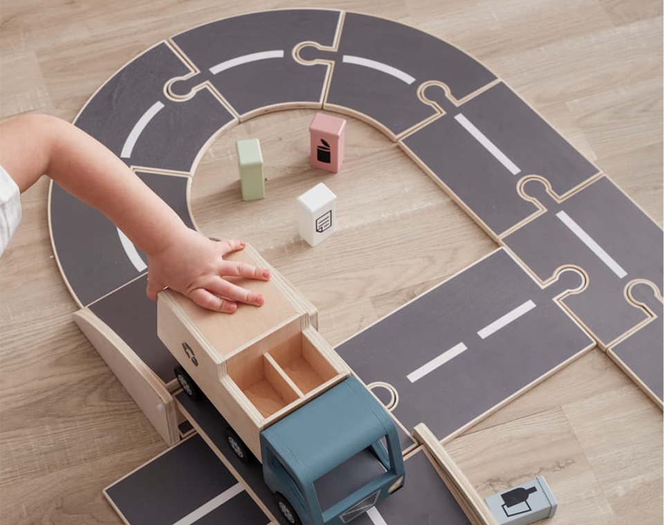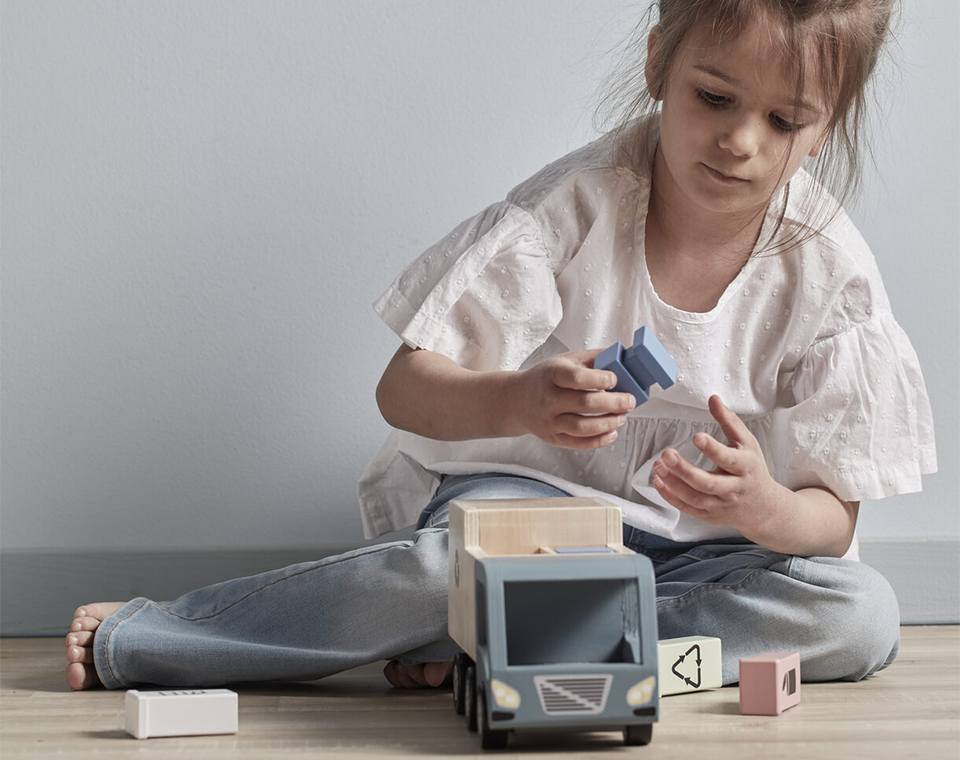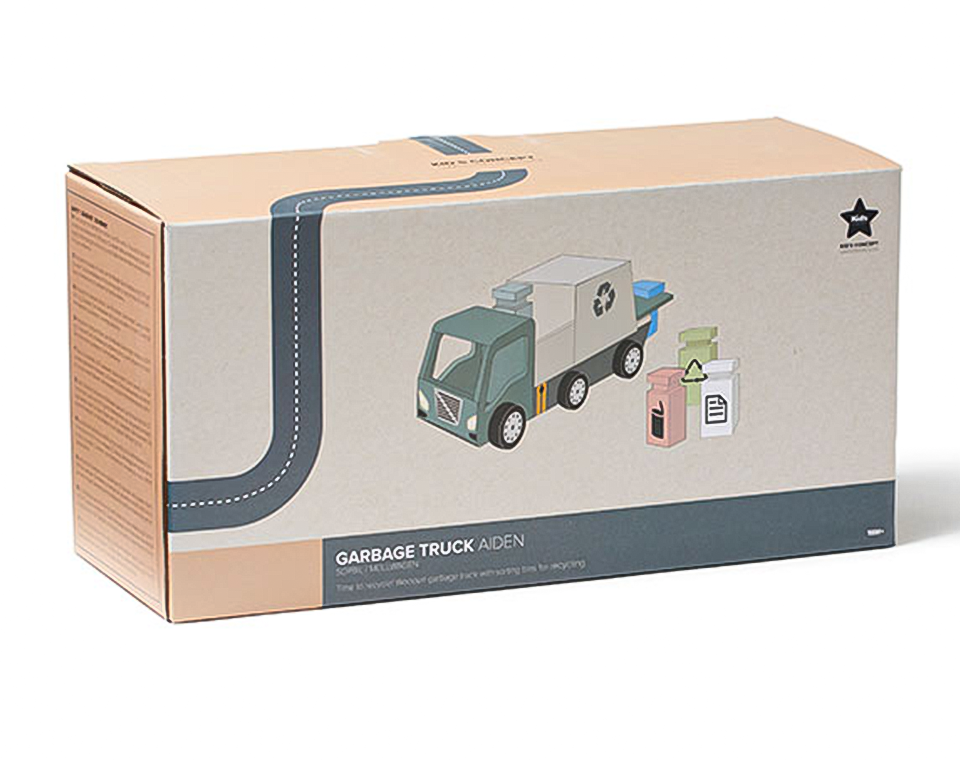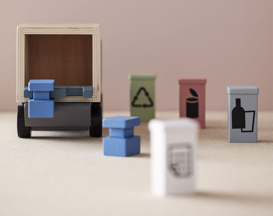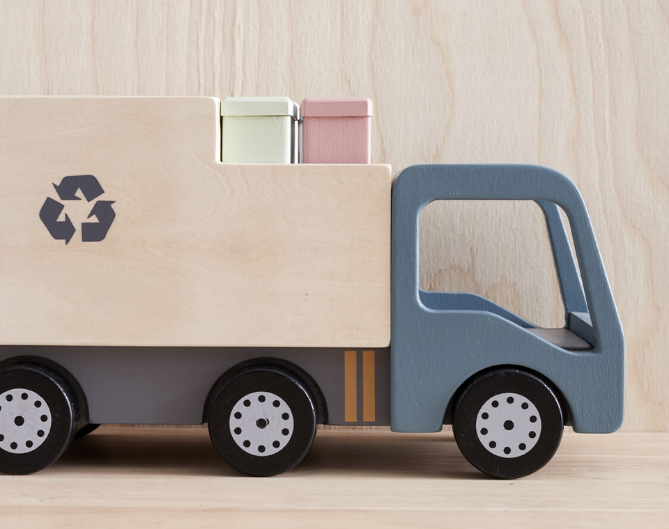 הגיע הזמן למחזר! משאית אשפה מעץ עם ארבעה פחי מיון למחזור.