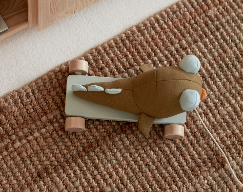 בובה עשויה 100% כותנה, על בסיס גלגלי עץ.