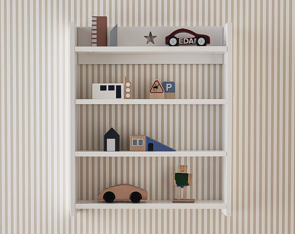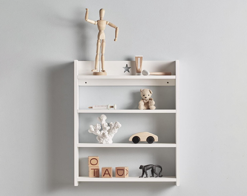 מדף קיר מעץ לבן מקולקציית STAR, מעולה לאחסן ספרים, צעצועים רכים ודברים אהובים אחרים.