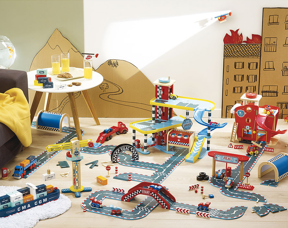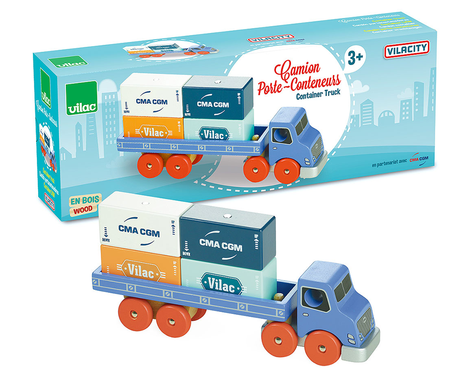 משאית מעץ הנושאת 4 מכולות מגנטיות, כחלק ממגוון Vilacity.