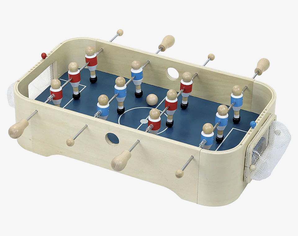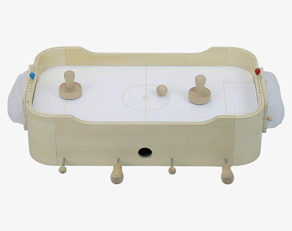 משחק שולחן 2 ב-1 מעץ עם משחק "הוקי אוויר" בצד אחד, וכדורגל שולחן בצד השני.