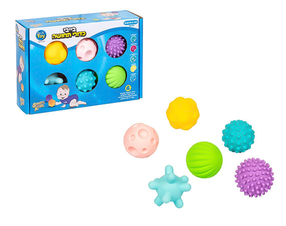 כדורי תחושה גמישים ורכים בעלי מרקמים שונים המותאמים לאחיזה בכף ידו של התינוק מבית באלי טוי