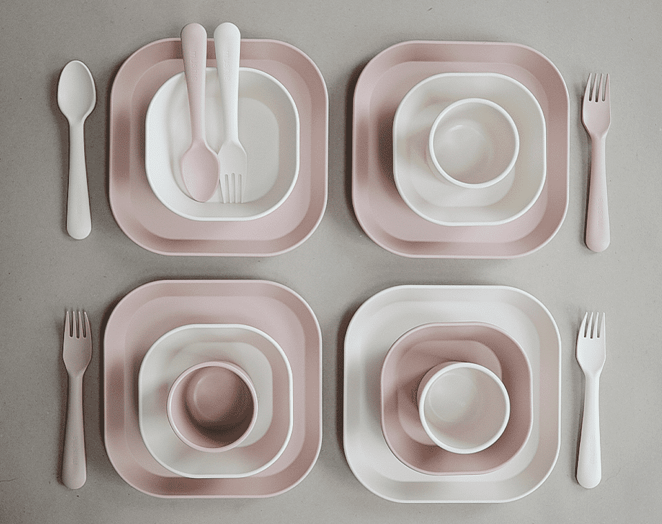 - סט כף ומזלג מבית מושי עשויים פלסטיק פוליפרופילן ללא BPA, מגיע במגוון צבעים רכים ועיצוב נקי וקלאסי.