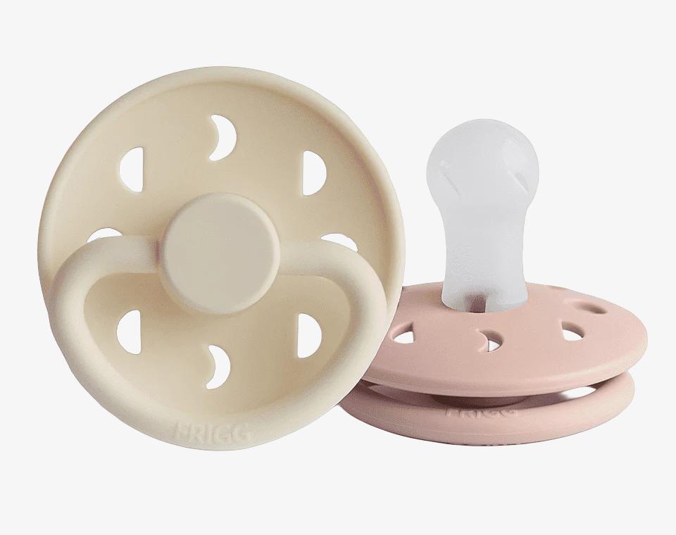 זוג מוצצי סיליקון מקולקציית MOON מבית FRIGG בעלי עיצוב ייחודי בהשראת הירח, עוצבו בקפידה בכדי לשמור על נוחות תינוקכם.