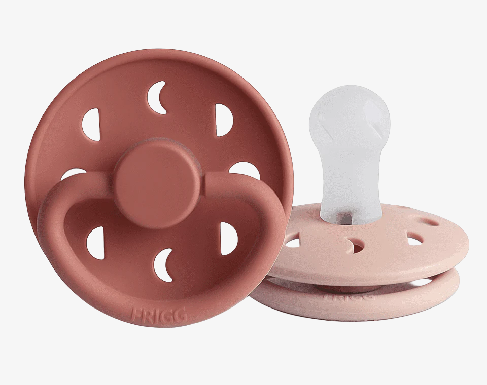 זוג מוצצי סיליקון מקולקציית MOON מבית FRIGG בעלי עיצוב ייחודי בהשראת הירח, עוצבו בקפידה בכדי לשמור על נוחות תינוקכם.