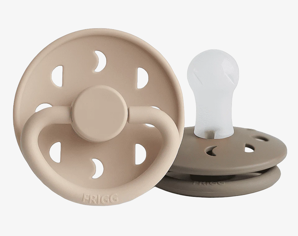 זוג מוצצי סיליקון מקולקציית MOON מבית FRIGG בעלי עיצוב ייחודי בהשראת הירח, עוצבו בקפידה בכדי לשמור על נוחות תינוקכם.