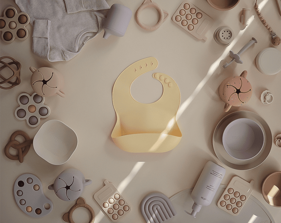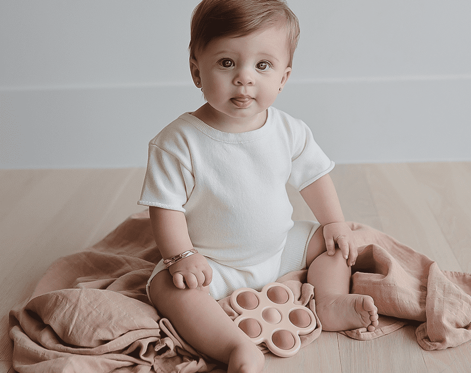 צעצוע לחיצה בצורת פרח מבית מושי מיוצר תוך התחשבות בידיים קטנות מעודד חקר חושי ופיתוח מיומנות מוטוריקה עדינה עם עיצוב נקי וקלאסי בצבעים רכים