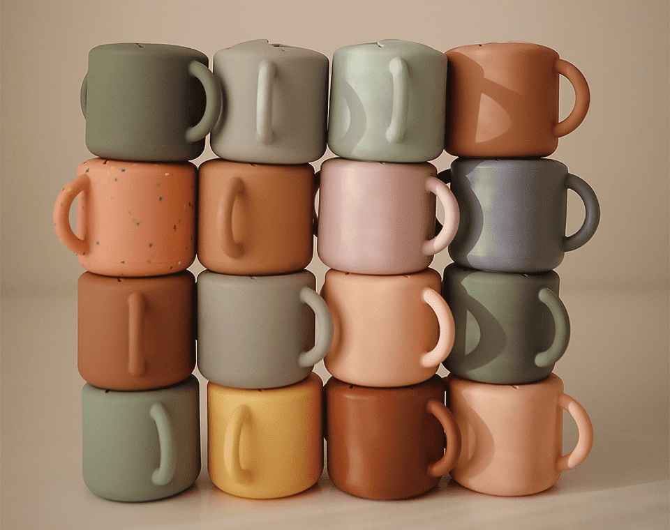 כוס חטיפים מסיליקון מעוצבת עם שתי ידיות קטנות לאחיזה עבור ידיים קטנות, ובנויה במבנה המגן על תכולתה